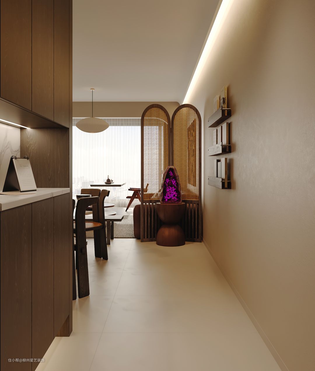 步入这个家的第一眼 便仿若走进了复古时代 宛若电影质感般的新家 随处散发着木质气息 藤编造型屏风+水景玄关 有效阻隔视线 引入光线