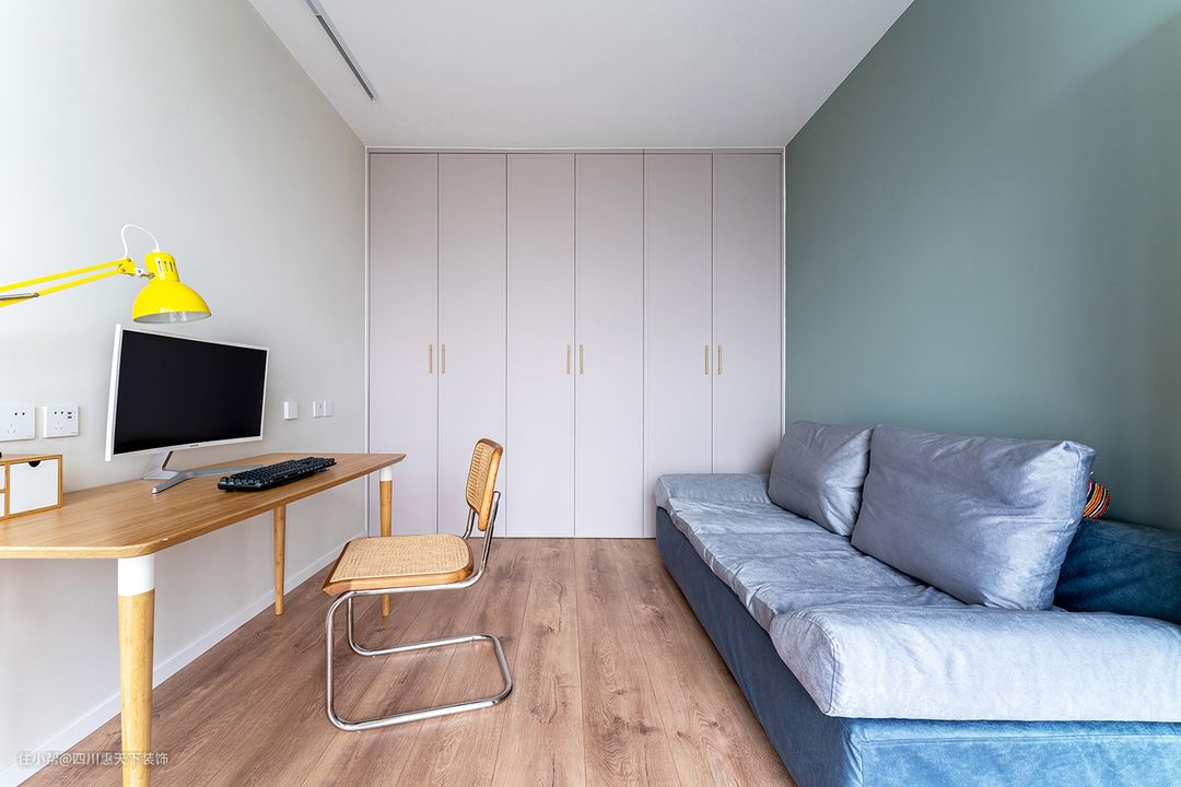 书房是安静的工作及放松之地,整体氛围干净晴朗。功能上让办公,阅读,临时客宿,全都可以满足,静谧而又惬意。 简单的一桌一椅,就是现代人的居家办公和游戏的空间。旁边预留了整排的通顶衣柜,也为以后的空间属性变化,预留了不同的方式。