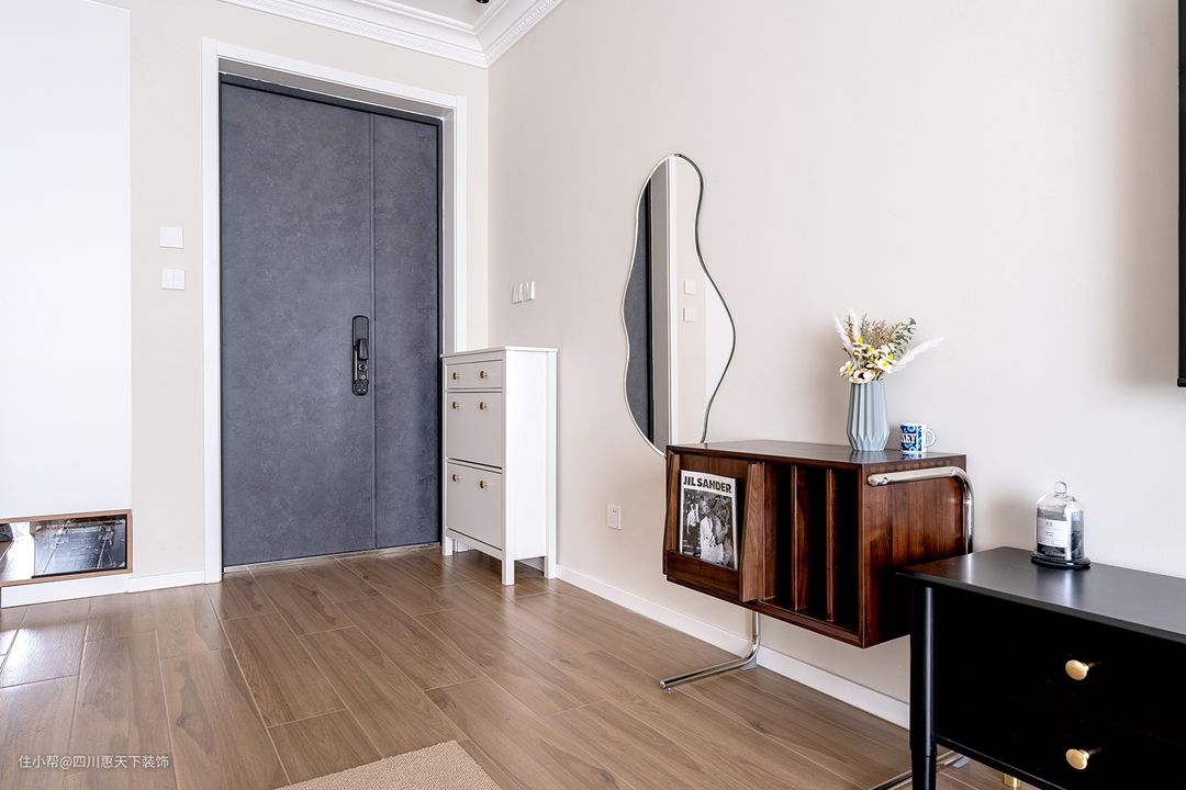 定制的综合收纳柜,将客餐厅和卧室的中转区域,连接在一起。不仅可以挂衣储鞋,还可作为放置装饰品的端景。底部腾空18公分,留出了灯带的空间,可以放置趣味的摆件,也让整面收纳不会显得笨重。木纹砖的通铺,也让空间连贯一体,开敞大气。 入门处设置了简易的鞋柜,搭配艺术感十足的曲线镜子,既能满足简单收纳需求,也让空间丰富多变。