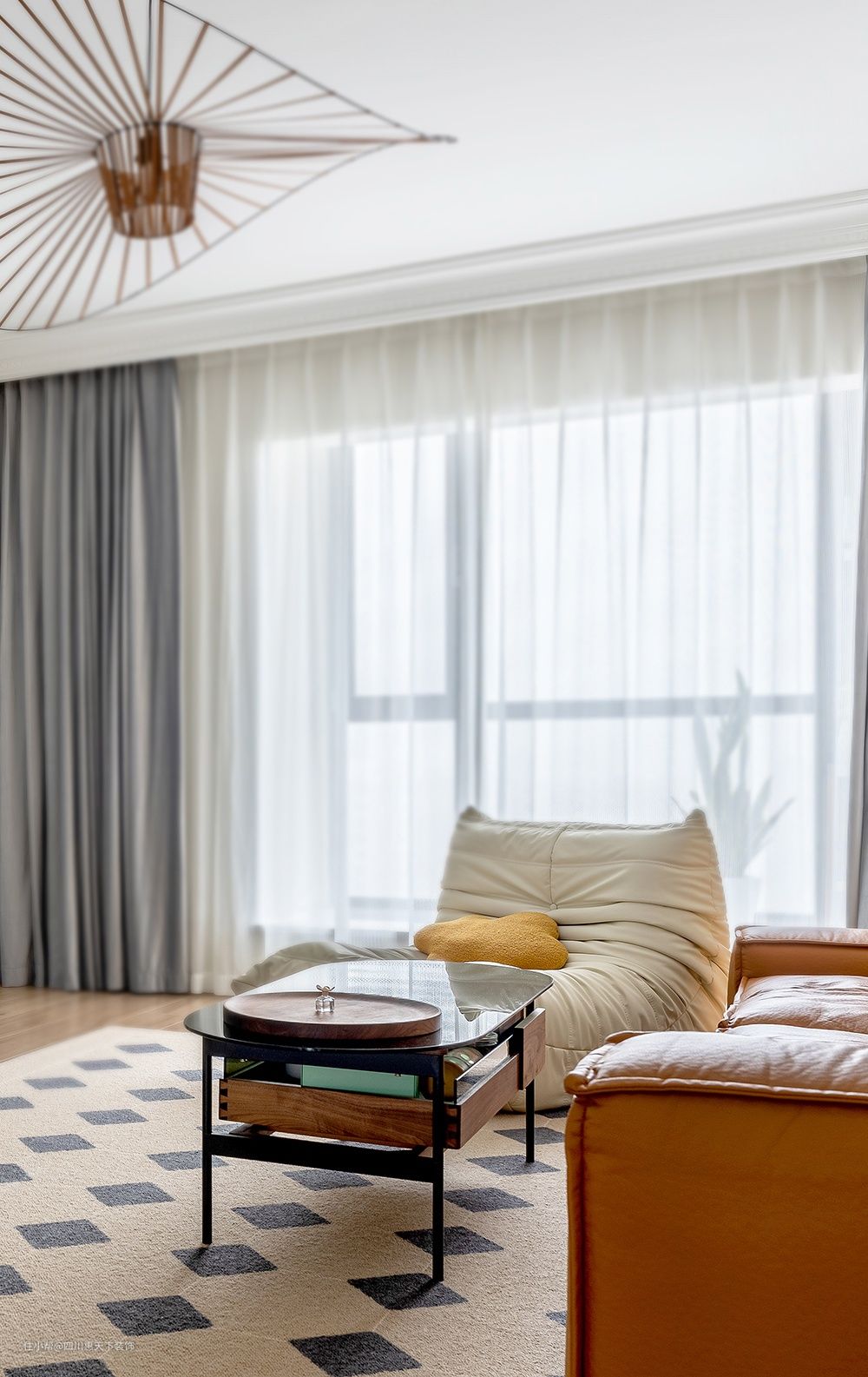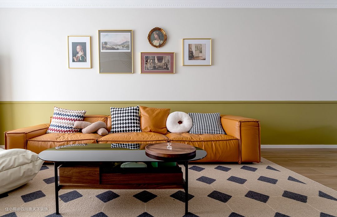 客厅以大面积的杏子灰为主,给予空间温暖的基调。沙发背景墙的上下分色,利用线条作区分,使空间增加了层次与变化。整个空间搭配复古精致的软装,营造出优雅温暖空间氛围。 空间注入复古的色调,散发出浪漫的温度。在光线的晕染下,不同的色调和谐交融,这是一个充满质感的温柔空间,同时也承载了对生活的期待。 不规则的装饰挂画,为空间增添些许艺术感,为家提升了生活格调与艺术品位。棕色皮质沙发,玻璃茶几,几何元素的地毯,组合成复古的味道,一种安静、美好的氛围油然而生。 杏子灰和网红海枣色,装饰沙发背景墙,形成拼色效果。平贴石膏板上墙,层次分明,气质满满。让整个家的文艺气息呼之欲出,恰到好处。 窗户旁放置一款慵懒的毛毛虫沙发,搭配圆润的玻璃茶几和草帽吊灯,散发出淡淡的轻奢感,为空间带来不过张扬的时尚,临近阳台,惬意的晒晒太阳,眺望窗外,读书喝茶,享受悠闲的慢时光。