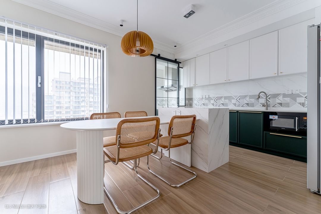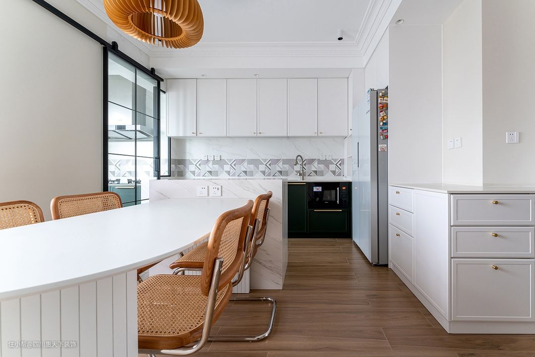 餐厅连接着西厨的中岛,搭配中古藤编的椅子,优雅复古的摩登气质应运而生。餐厨使用环绕型动线,空间灵活动线顺畅,让整个空间自由而通透。 干净素雅的白色餐桌,复古又简洁的餐边柜和西厨,搭配顶部精致的石膏线条和低垂的南瓜灯,营造出温和浪漫的用餐氛围,让宅家的每一餐,都有满满的仪式感。 木质的温暖,杏子灰墙面的轻柔,岩板的整洁,以及搭配不同质感的家具进行融合。温柔的色调和家具的质感,塑造出更自然、舒适的用餐环境。日常一边烧菜的同时,也可以跟家人交流,与最亲密的人享受柴米油盐带来的乐趣。 南北通透的格局,让整个空间通风采光俱佳,阳光透过百叶,将光线洒入室内,构成光影的层次。中厨单独隔出,西厨与餐厅相结合,避免油烟的前提下,释放出更多的生活空间。扩大了空间感,提供更多的生活场景,营造全新的生活方式。