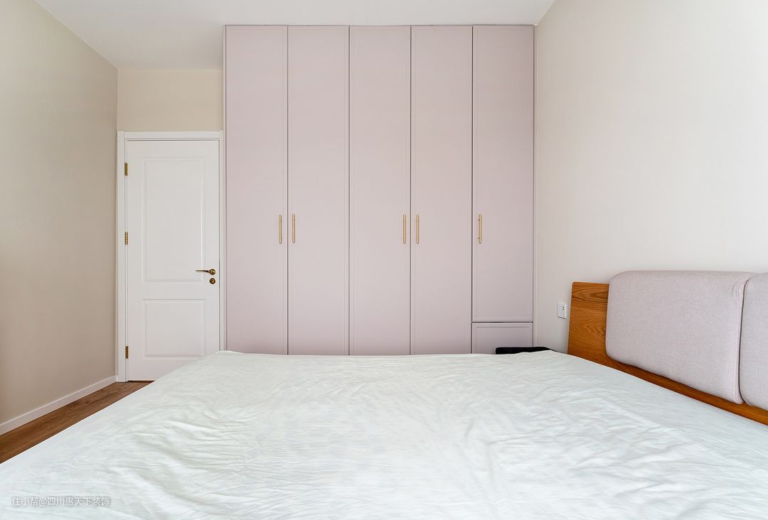 床头和地板采用同色系,柜子和床头软包采用同色系。墙面是弱暖的温馨,床品是弱冷的素净雅致。内在相互联系,相互呼应,连接成了一个整体,形成一种全放松的空间。 次卧强调安静自在的舒缓感,大面积使用杏子灰,搭配自然气息的复古绿窗帘。原木结合布艺的床头混合设计,舒缓整个空间,并带有一丝生机与从容感。 在木色床头与复古绿窗帘之间,搭配一个小面积的白色床头柜和黑色的小台灯,降低颜色的冲击感,且小巧而实用。