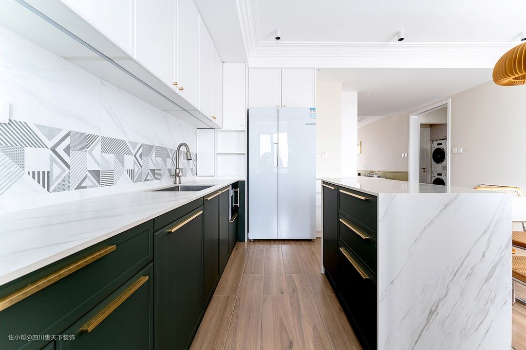 厨房高柜与地柜相结合,内嵌一台不小的冰箱。不仅削减了大电器的突兀感,还提升了收纳空间。让零碎物品,通通可以收进柜子里,保持厨房的整洁干净。橱柜采用白色吊柜与复古绿地柜的潮流搭配,柜子上细窄线条与整个空间相呼应,增加层次感。配上金色的拉手,给予空间简洁轻奢的质感。 岛台里侧是丰富的储物空间,台面是光洁坚硬的岩板。在岛台与餐桌之间,预留出了方便餐桌使用的插座电位。由远处橱柜的高,到岛台的中,再到餐桌的低,让空间层次分明。餐椅与橱柜的复古质感相呼应,在简洁的色调和质感,显得独立优雅。