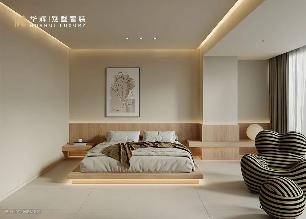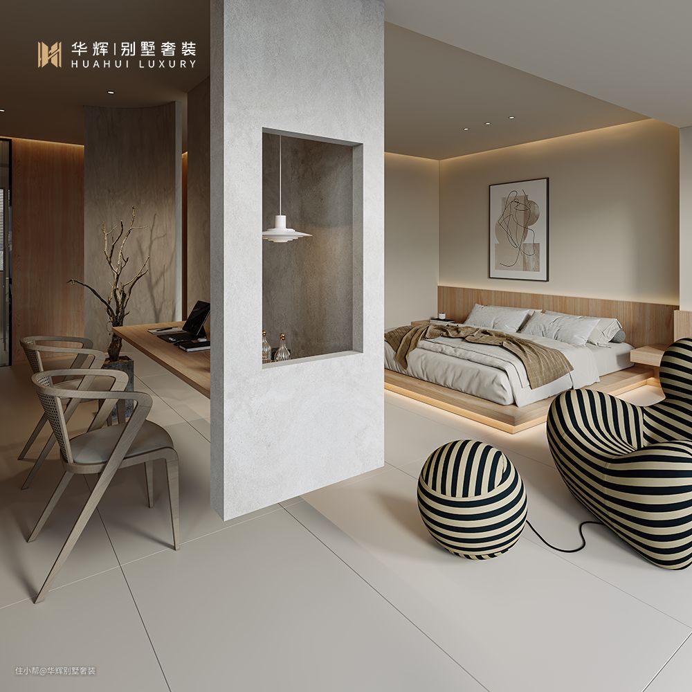 卧室,延续了侘寂风的简约质朴。简单的空间布局,一切自然而成。地面想要更好的整体性,可以选择水泥自流平、微水泥等材质。如果选择贴地砖、推荐选择灰色砖,砖的规格可以选择略大一点的。
