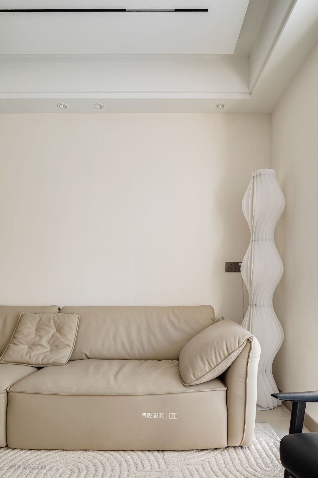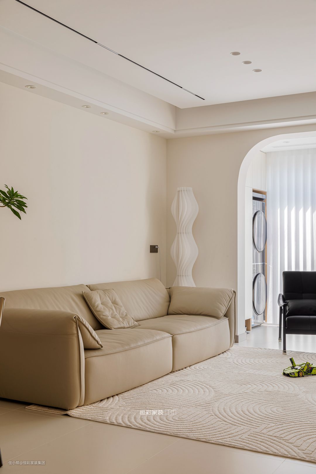 客厅装修以奶白色为主,以清新简洁的氛围引领空间的设计。悬浮吊顶营造出舒适而幽雅的氛围,无主灯设计进一步强调了空间的轻盈自然。 电视背景采用石膏板上墙装饰,其圆弧形设计自然流畅地延伸至阳台门洞,与空间形成和谐的连贯感,嵌入式设计使整体空间更加简洁利落。 客厅以地毯代替茶几,打造互动型儿童活动空间。有娃家庭才懂得,这样的客厅实用又灵活。