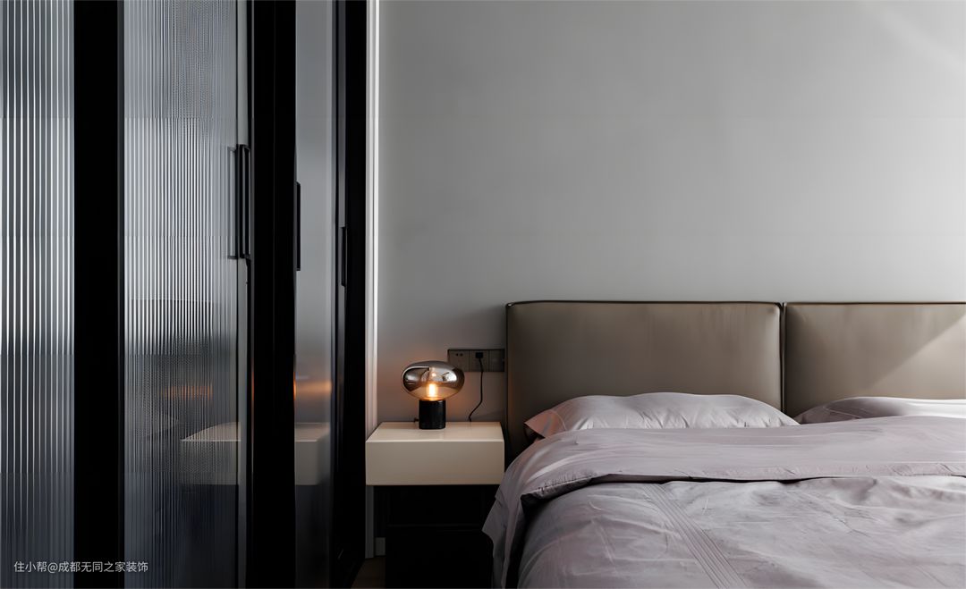 棕灰色的床头和灰色艺术漆可以彰显房主冷静成熟的性格,没有主光源,采用点光源和床头灯照明,更能凸显现代的氛围。床尾右侧是一排梳妆台,为女业主提供了一个梳妆打扮、阅读品茗的专属舞台,飘窗台的开放格也为书籍、护肤品提供了“容身之处”。