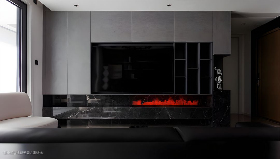 在这个沉稳霸气的黑白空间里,既有黑的凝练,又有白的纯洁。而具有过渡作用的灰色调,则依附于开放式书房背景墙和客厅地毯上层层渲染开来。将阳台的视觉纳入客厅,宽敞的落地窗带来明媚的光线。整墙收纳式电视柜设计,黑色壁龛与水泥灰柜体穿插结合,层次立体,收纳力强;电视墙采用水泥质感柜子和深灰色大理石地台,与超薄嵌入式电视形成经典黑灰拼色,简约、纯粹,依靠一组地台电视柜解决收纳。在有限的空间里实现收纳和空间感的合理平衡。雾化壁炉的加入,增添了客厅的氛围感。视觉上壁炉温馨感拉满,功能上增加了空间湿度,在冬天干燥气候开空调开地暖真的实用。垂直竖向的圆形组合吊灯拉伸了空间纵深感,让室内层高看起来更高;而水泥质感+悬吊书架造型出墙设计+内嵌黑色超薄电视+深灰大理石地台的背景墙设计,兼具现代的设计感和空间的实用性,让空间看起来更加整洁,更显品质。
