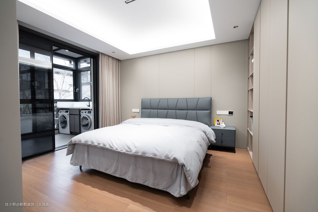 次卧采用了木质元素与白色调的使用,保证了整个空间的统一性床头墙以木饰面为背景,布置上灰蓝色的皮质大床以及白色床单,使得卧室拥有朴素安静的体验。 靠墙一面墙全部打造成为开放格+收纳柜的组合,且上下做了通顶的设计,防止藏灰,没有卫生死角。开放格摆上房间主人喜爱的各个摆件和书本,封闭式柜子轻松收纳一年四季衣物。 利用玻璃门推拉门将阳台与卧室隔断,不仅可以让卧室更加的安静,独立的阳台空间还可以做成洗衣区、晾衣区。