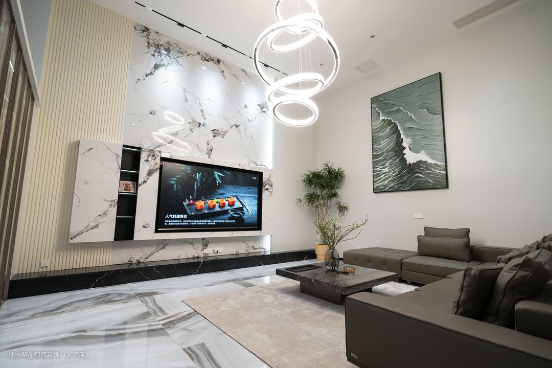 客厅与玄关处利用白色大理石吧台做隔断,独特纹理的大理石,尽显简约大气风;搭配两把高脚凳和一株鲜花,给平淡的生活增添一点情调。 客厅做了挑高设计,四面通透,尽显大宅气势;同时安装环形旋转大吊灯,加上艺术挂画、郁葱绿植为点缀,既能减少空旷感,又能增添空间的美感。L型的深色皮艺沙发拥有舒适的软包造型,加上浅色的地毯和黑色大理石茶几,让客厅也变得更加的优雅和精致。 电视背景墙是纵横交错的大理石风格,黑色的独特纹理就像一幅独特天然的艺术作品,侧边辅以木格点缀,让这里也能成为整个客厅的视觉要点。并将电视嵌入其中,整洁、美观,还带着丝丝轻奢之意。 客厅最大的设计亮点便是靠墙打造了满墙的酒柜,酒柜采用金色柜门和玻璃柜门共同打造而成,玻璃柜门内打造了储物格并配有灯带,存放美酒。