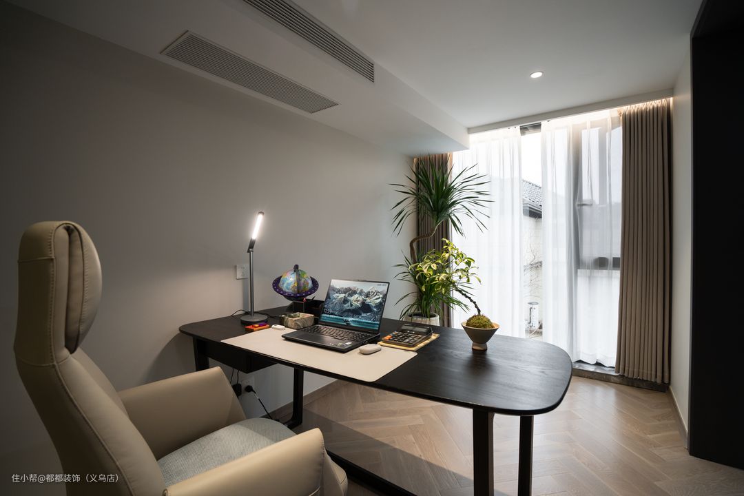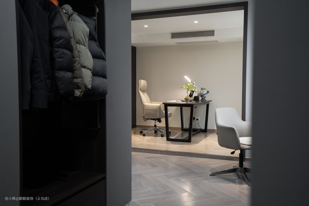 人纹路的木地板结合大白墙,搭配嵌入式射灯装饰,呈现出现代风的气息。靠墙设计一排深木色通顶式书柜,开放式与封闭式结合的造型装饰,美观大方又实用。 书柜前下设计同色系书桌,宽敞又舒适,桌上布置绿植、趣味摆件和台灯,让办公也成为一种享受。