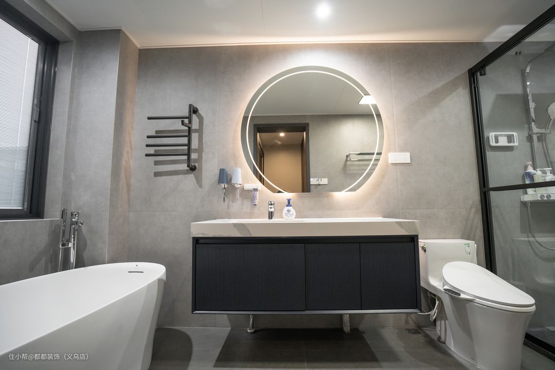 白色洗手台与黑色收纳柜相结合,经典黑白配,耐看好用;圆形镜子暗藏灯带,勾勒出有趣的几何形,使空间变得生动有趣。搭配一个洁白色的浴缸,在这里可以享受泡澡的乐趣,让人感觉更十分的舒服。
