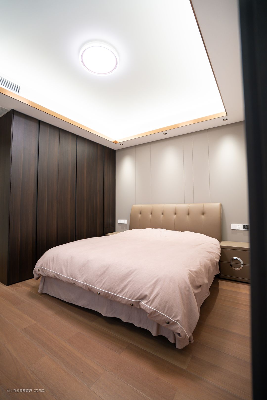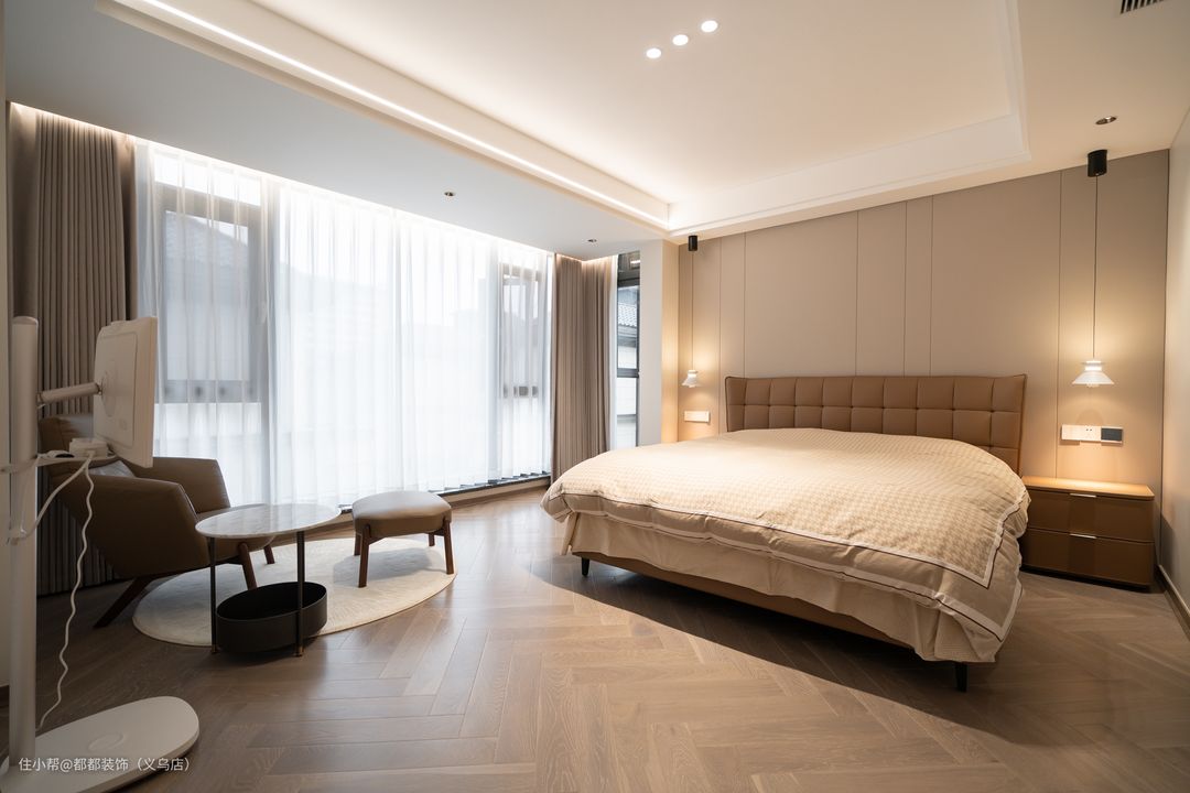 一楼的卧室打造成父母房,方便老人家进出,并且整体设计与客厅相一致,在双眼皮的基础上嵌了一圈金属线条,加上圆形灯饰,妥妥增添了轻奢氛围感。 靠墙位置打造一排到顶的大衣柜,收纳空间超级充足了,天然木材的搭配,轻松营造出令人舒适、放松的休息环境。
