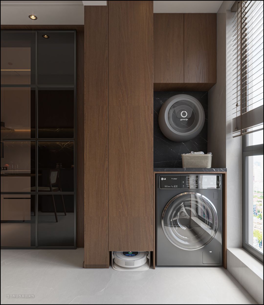 阳台洗衣优势,储物分区明确 洗地机无障碍通行 壁挂洗衣机的增加设备更完善。吊顶内嵌隐形晾衣架,摆脱常规 更具美观