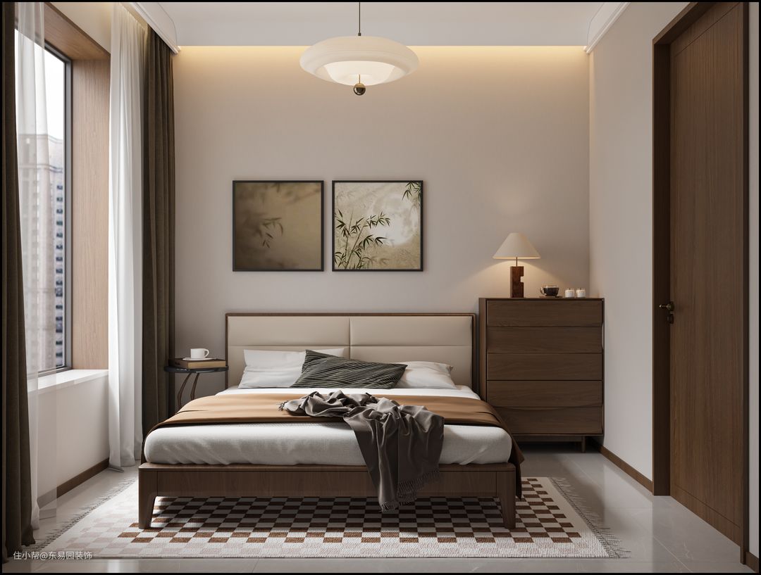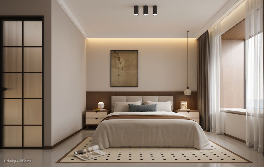 主卧大地色调更具沉稳 无主灯氛围感拉满 飘窗取消大理石覆盖一周木饰面使空间更温暖。柔软的床榻加之智能设备窗帘 起床和入睡都是仪式感