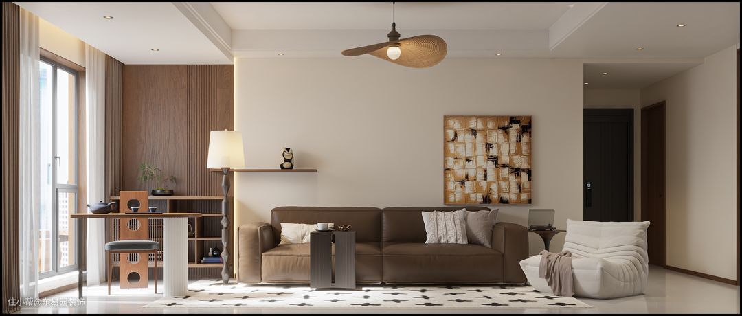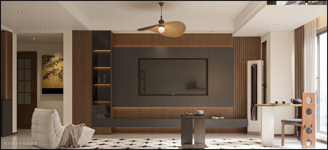 软装美拉德风,大地色为基调,几何挂画和南阳台木饰面氛围感满满,电视柜是整个空间的重点 它的设计更呼应了软装的定义 兼顾了储物和美观