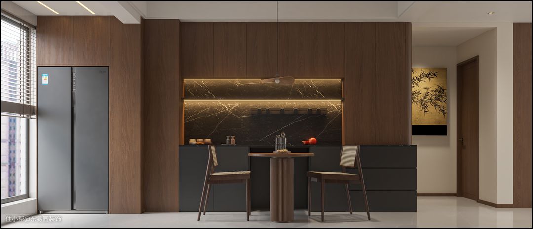 冰箱挪到北阳台。餐厅通往北阳台垭口运用和柜板一样的颜色使整体空间有延伸感同时餐边柜更有整体性。岩板台面上翻使餐边柜台面放置电器更随心所欲。右侧弧形柜子过度不压抑还时尚
