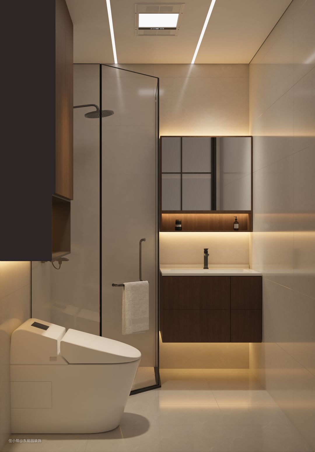 原有装标不动,女主人有囤货习惯。浴室柜镜柜和地柜的增加。马桶上方巧妙利用空间增加吊柜,干湿分离更加便利。