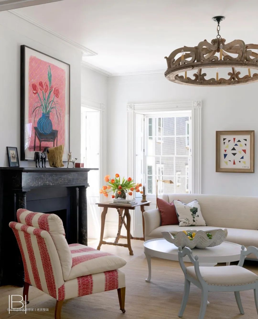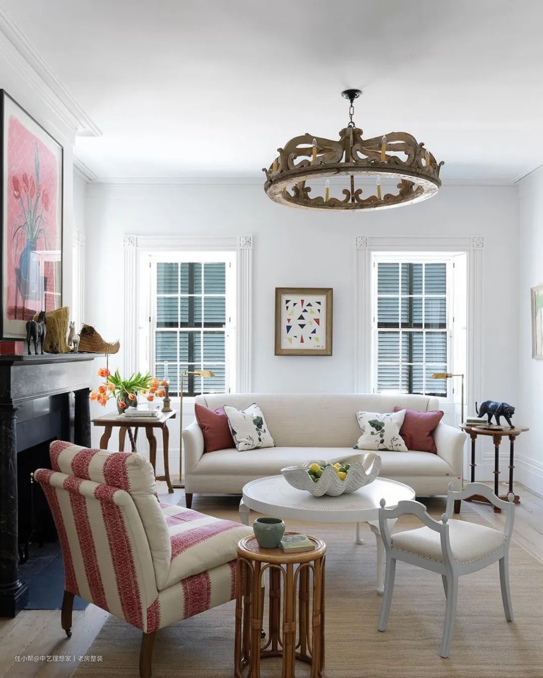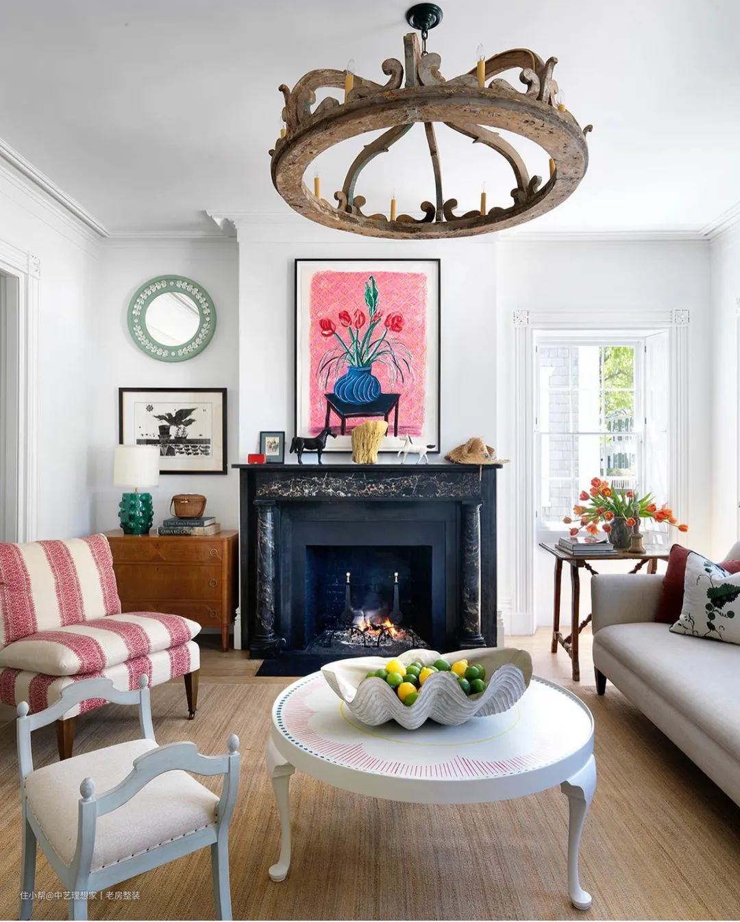 除了非常有特色的古董家具灯饰,咖啡桌是设计师的作品,灵感来自查尔斯顿的餐桌,桌面有绘制图案,上面摆放的果盘也是实木雕刻的,还有很有特色的拖鞋椅等,让这个客厅充满个性也极具艺术感。