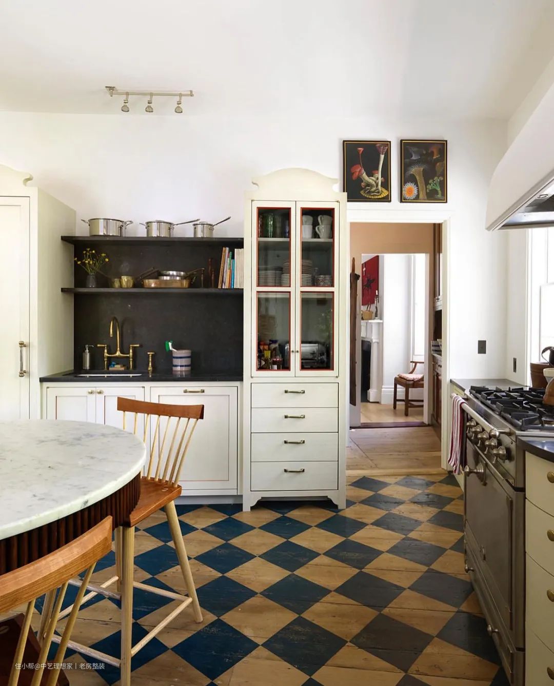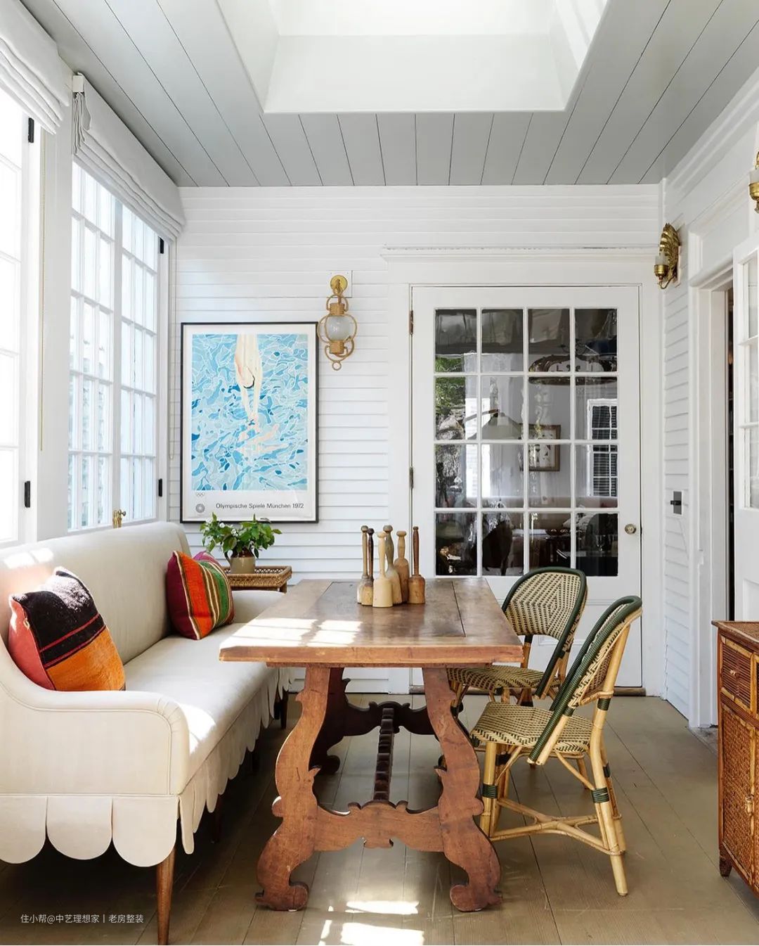 蓝色的边柜则是独家设计定制的,大理石餐桌也是专门定制的,桌子和台面高度相同,这样也适合烘焙实用。地板则是通过粉刷,菱形格的设计增添了复古氛围,整体看起来没有太精致而显得更有生活气息。早餐角通向门廊,所以采光非常优越。墙壁和隔板一样全白色,天花板则是淡淡的蓝色,古董的餐桌从英国而来,搭配上藤编椅和舒适的亚麻长椅,在这里享受阳光与咖啡面包相伴的早餐时刻,无比惬意。