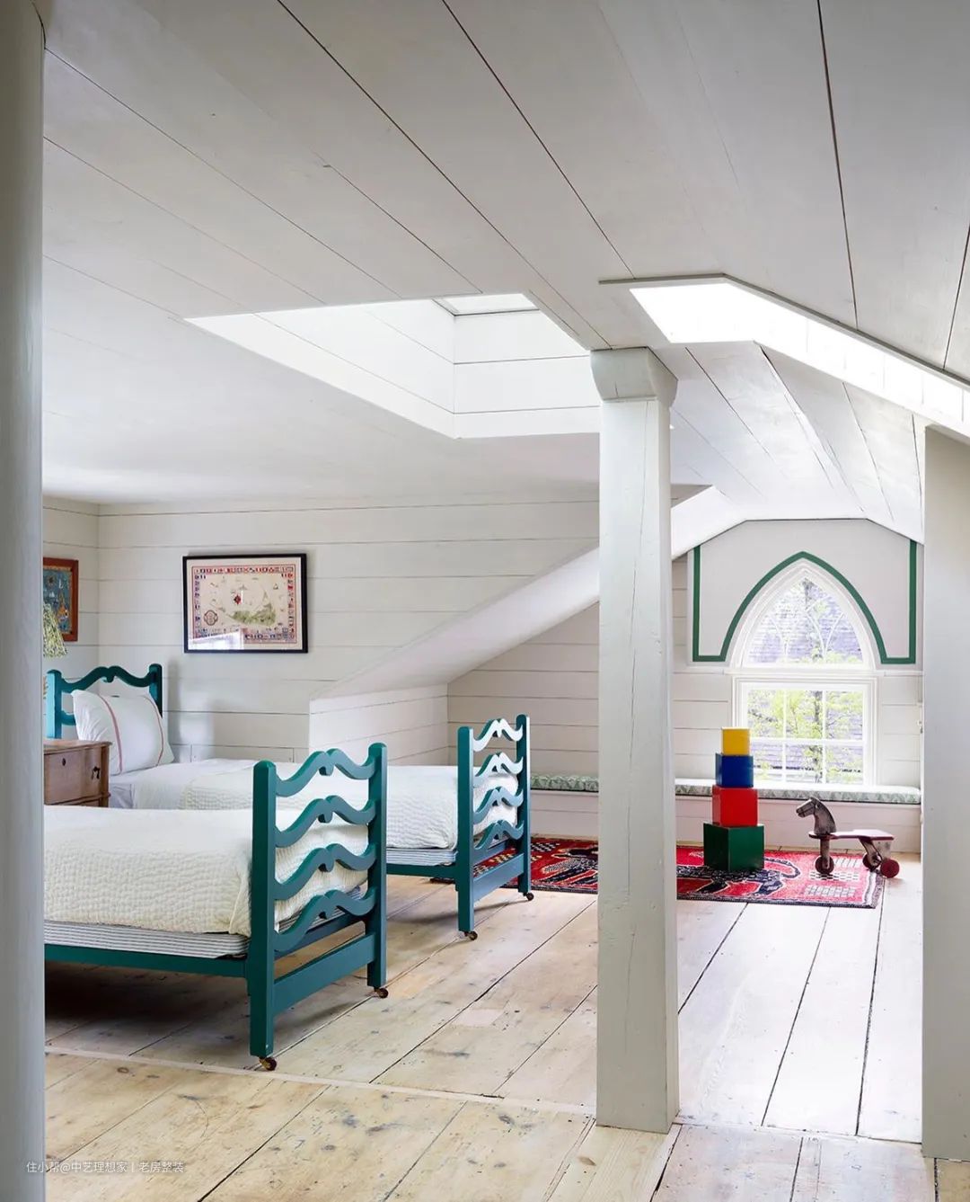 在这个专门为主人家男孩们设计的阁楼房间里,在墙壁和天花板上装上如船板一样的装饰板后涂上白色,然后翻新了大宽幅的旧木地板,涂上蓝绿色的床和哥特式的窗户处理,也为空间带来更多亮点。