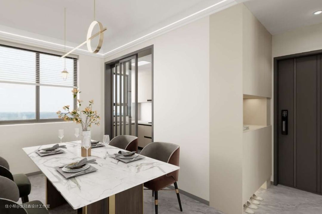 💨业主需求:四口之家,90后新生带家长,两个小孩,各自有独立的空间,两个次卧需要书桌,餐厅可以兼顾聚餐,和家庭洽谈交流。卫生间干湿分离,整体色调干净温馨。 💨设计理念:方案在色彩上主打暖白色系,给整个空间带来了舒适、温暖的感觉。通过运用不同材质的搭配和岩板纹理的混搭,创造出丰富的层次感。 在细节上,又通过简洁利落的线条、金色材质、装饰灯等点缀表现出了一种现代轻奢风格。 客厅中,沙发,餐桌,椅子和茶几的搭配以及柜子灯光的设计衬托出现代轻奢的韵味。 家具和装饰很简单,但它们都融合在一起,组成了一幅流畅的画面。
