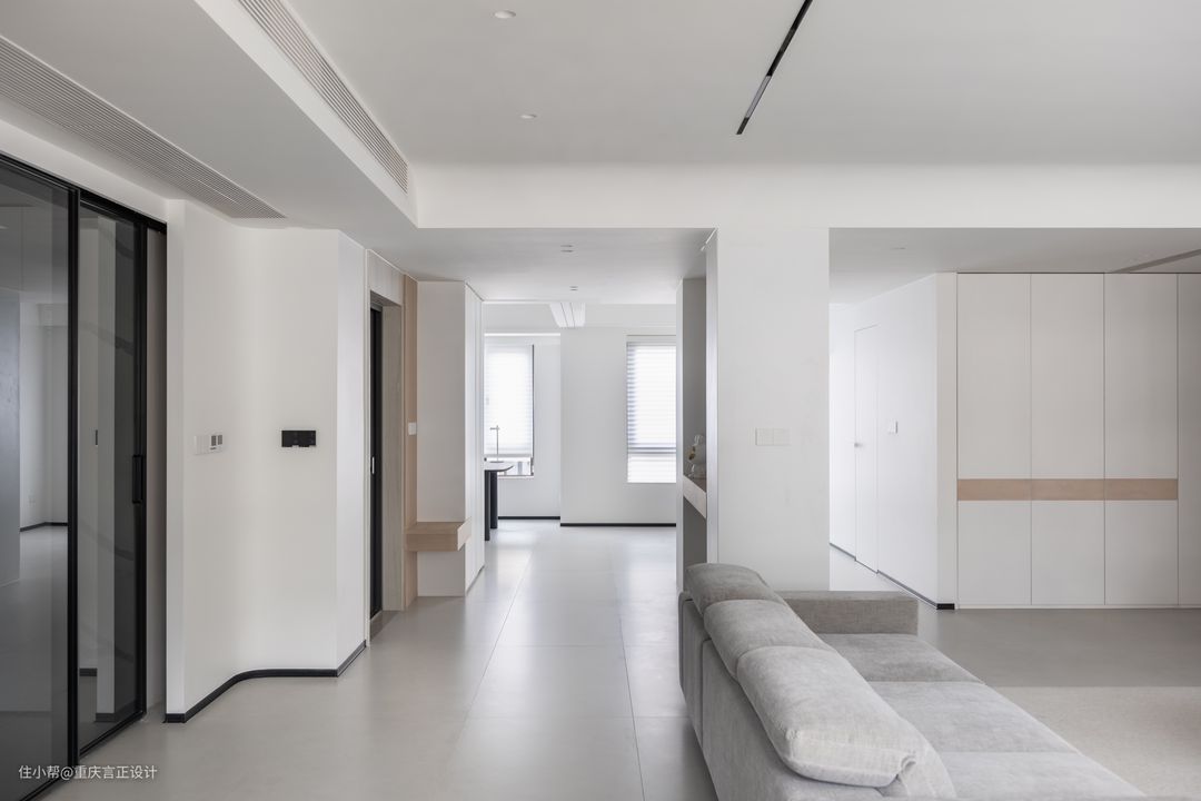 双玄关在不同的区域给予居住者不同的感受,同时该玄关还具有收纳功能、既满足了对隐私的保护,客厅、餐厅、书房、过道这几个区域完全通畅,无明显分界 ,主打一个通透。