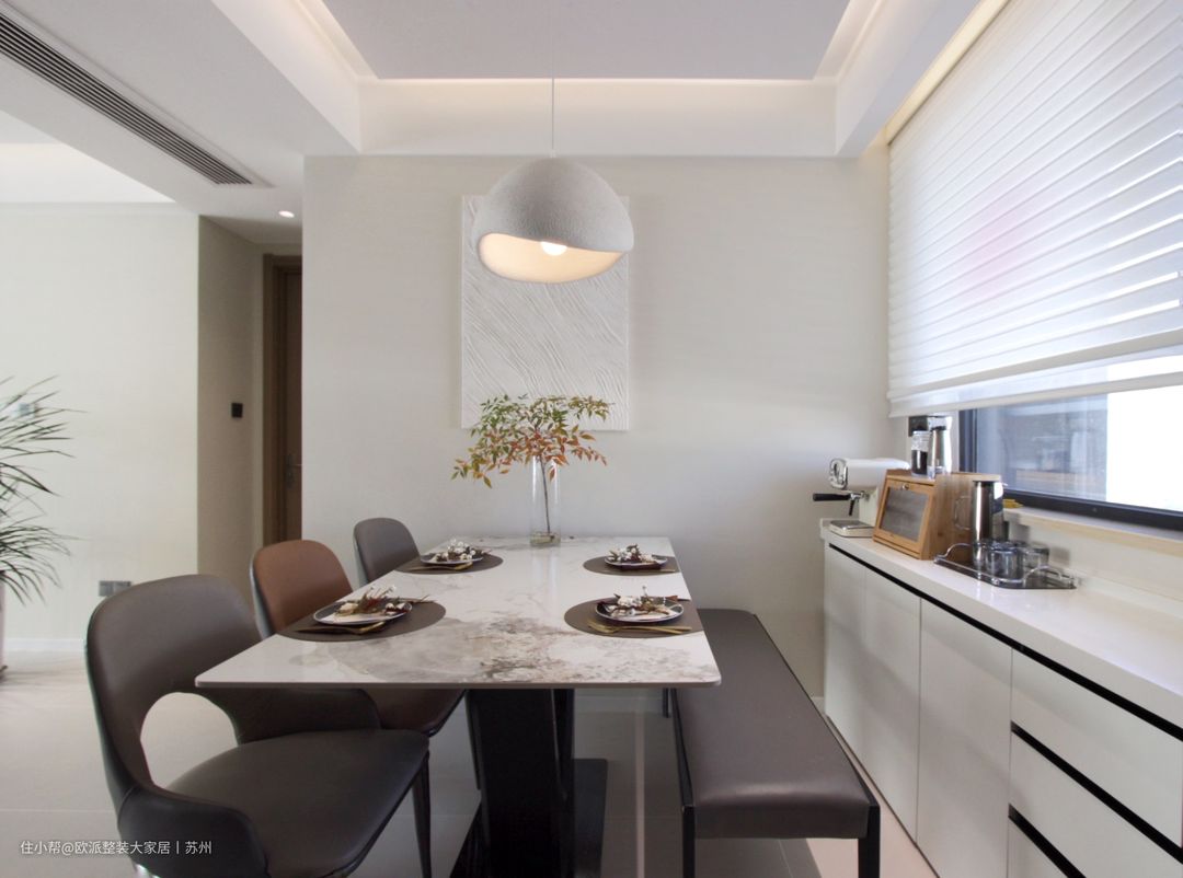 1 餐厅位于窗边,让就餐幸福感瞬间up,餐椅加长凳的组合自由度更高。窗下打造收纳柜,弥补厨房收纳的不足,台面可以放置小家电及各类玻璃杯具。 2 奶油墙面与现代家具带来优雅的感觉,艺术装饰画的搭配让餐厅更有个性。 3 另外在玄关处打造了一组玻璃酒柜,柜体内的灯光让整个酒柜内的物品一目了然,增强了空间的装饰感与层次感。 4 选用诧寂风奶油吊灯,微水泥材质设计,其细腻肌理与暖调灯光相遇时,为空间增添不少气氛,真正实现美与生活的平衡。 5 岩板桌面赋予了餐叙空间一抹高端的气质,再加上适时更换的绿植,餐叙之时也能幸福感满满。