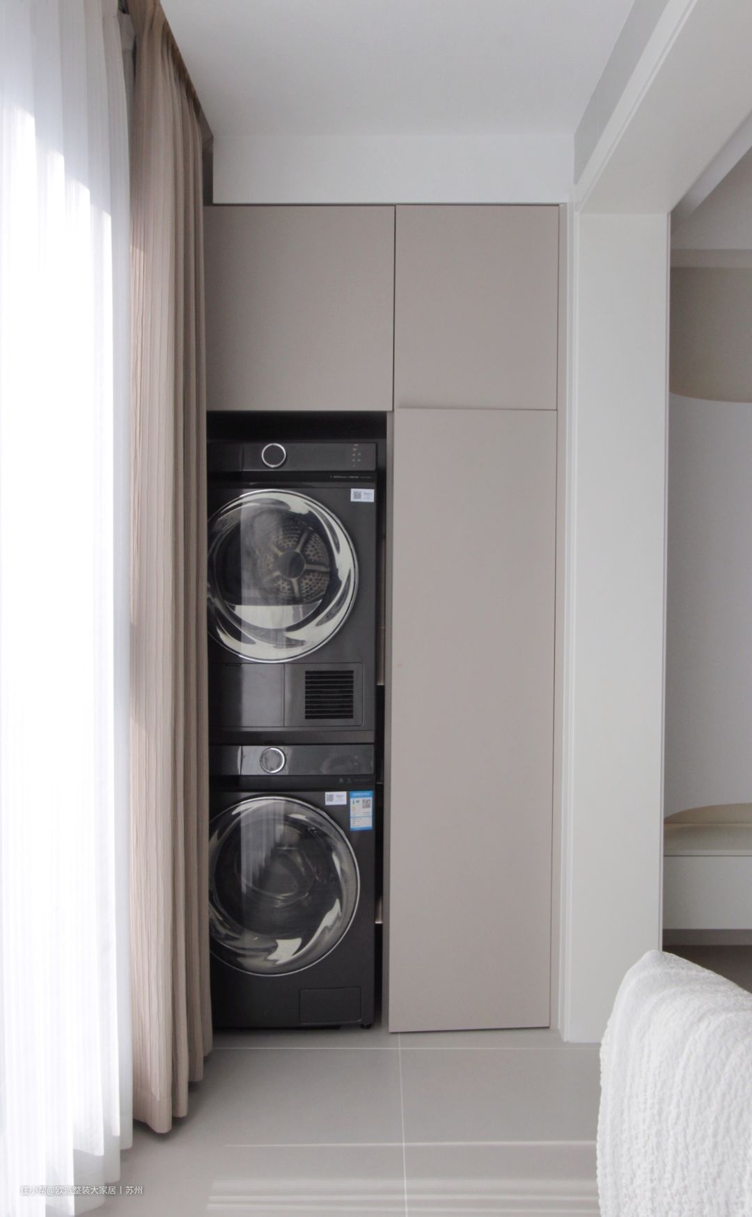 1 阳台空间合理规划,定制收纳柜,将洗烘机叠放内置其中,既保持空间干净整洁,也能满足业主一家日常杂物的储物需求。