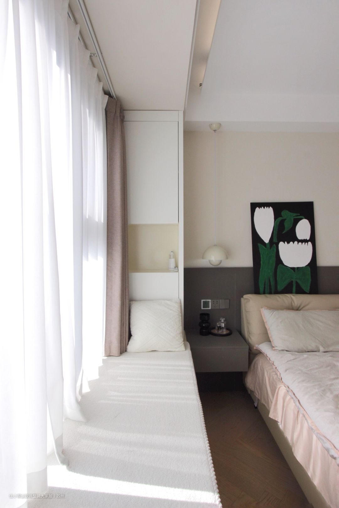 1 来到主卧,背景墙分为奶咖色和灰色上下两部分,来增强空间的层次感,奶呼呼的靠背双人床,搭配一体化的悬空式床头柜,简约中又不失精致。 2 一侧的飘窗打造成休闲区,加上软垫与抱枕,让空间多出舒适氛围。飘窗右侧还定制了一列收纳柜,放置书本、玩具正合适。 3 定制收纳衣柜,大大提高空间收纳力,并且在衣柜延伸出床头置物区,不仅提高了睡眠区的隐私性,还代替了传统床头柜,一体化的设计让主卧更显干净、利落。 4 床尾摆放梳妆台,方便女主人每天早上护肤、更衣、梳妆。 5 同时在主卧门后空间也做了一组通顶衣柜,上部收纳换被褥,下部收纳当季衣物,从而进一步提高空间利用率。