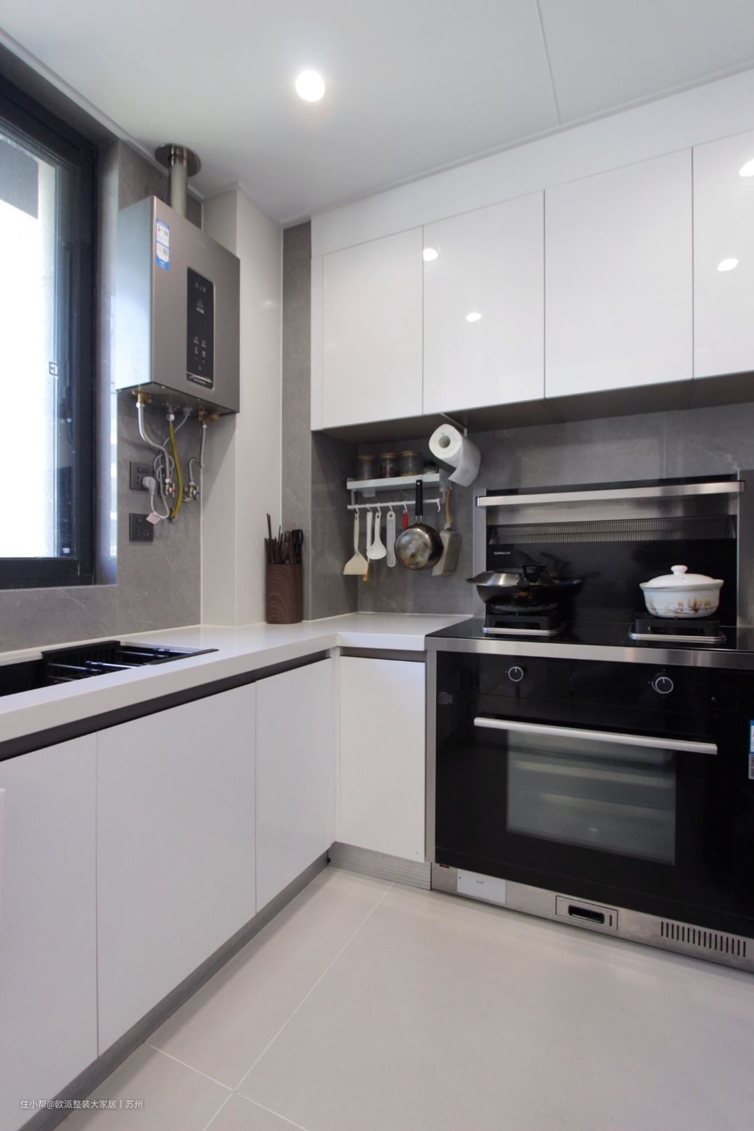 1 L型厨房布局设计,让“洗切炒”动线更合理,取物、洗涤、备餐、烹饪.....一气呵成。 2 同时采用蒸烤一体集成灶,成功地解决了屋主家人所担忧的油烟问题。