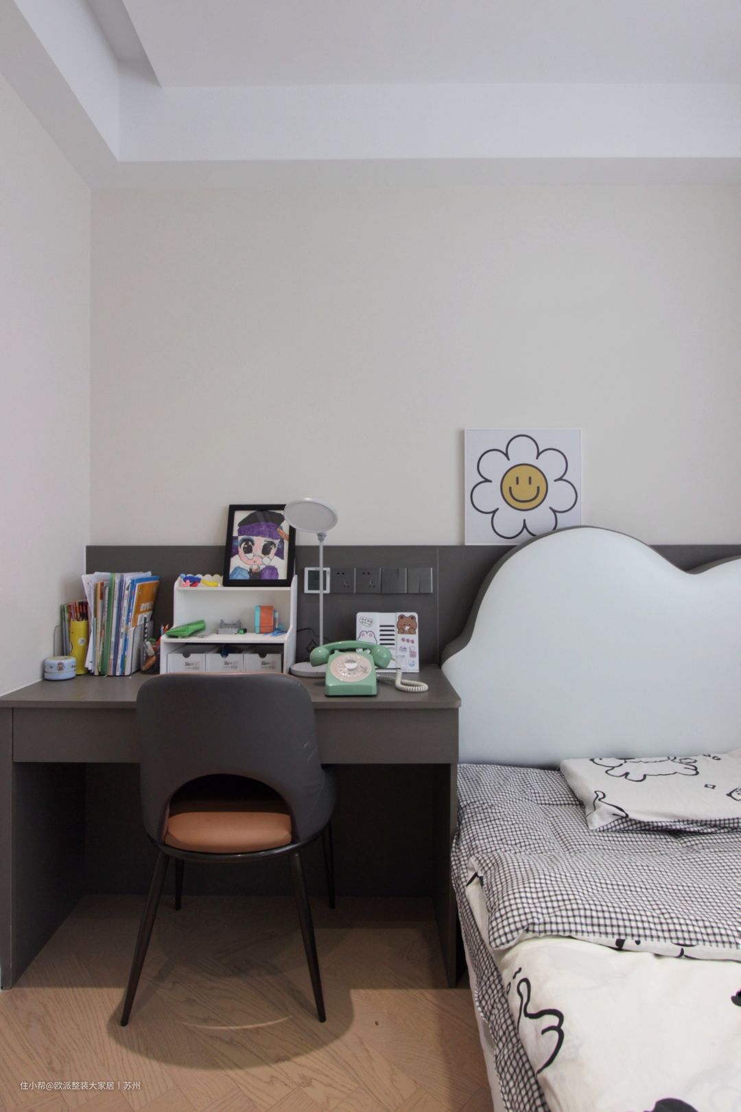 1 儿童房与主卧装修采用相同手法,背景墙分成上下两部分,起到很好的呼应作用。云朵造型床头,加上童趣感床品,让室内洋溢着可爱温馨的氛围。 2 床侧配备灰色书桌,加上精致的摆饰品与读物,为小主人提供了实用舒适的学习与睡眠环境。  3 定制整面墙衣柜,增加收纳空间。并延展至转角处,转角处及衣柜中间打造开放柜,既可以作为装饰品的摆放区,也成为了一种功能丰富多样的设计。