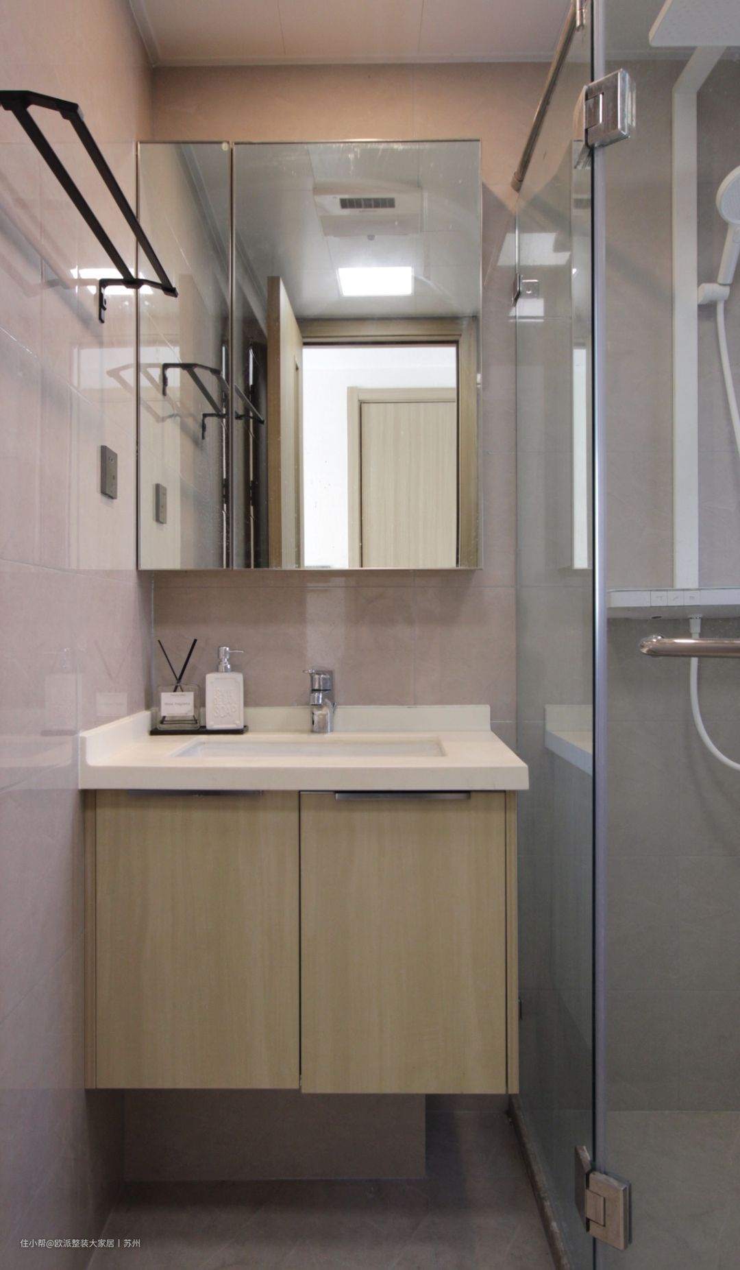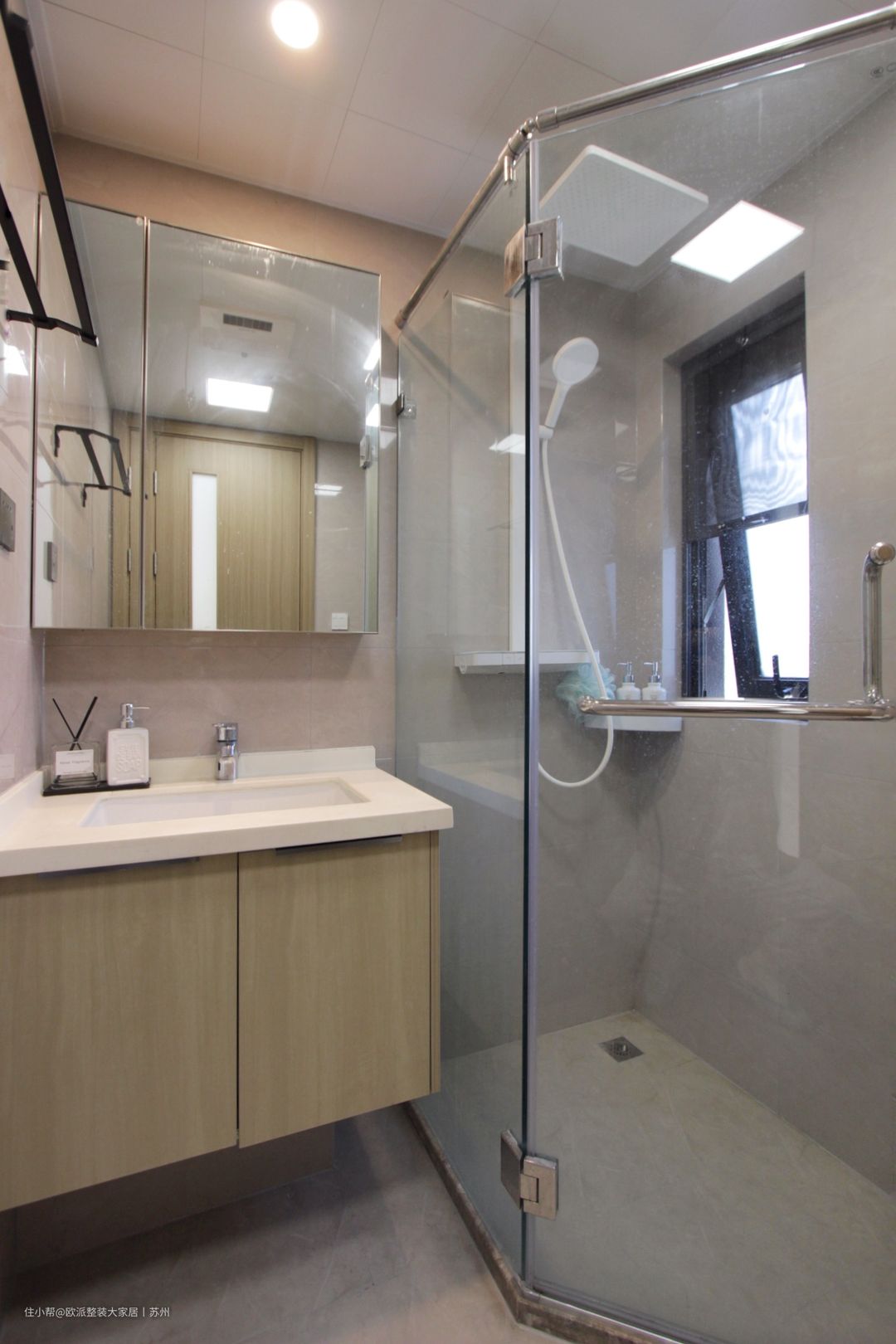 1 主卫选用浴室柜+镜柜的组合设计,满足卫生间的收纳需求。镜柜用来放瓶瓶罐罐,浴室柜则用来收纳一些备用的洗浴用品。 2 整体采用干湿分离设计,不仅可以保持卫生间室内的干燥,还可以避免潮湿的室内滋生细菌