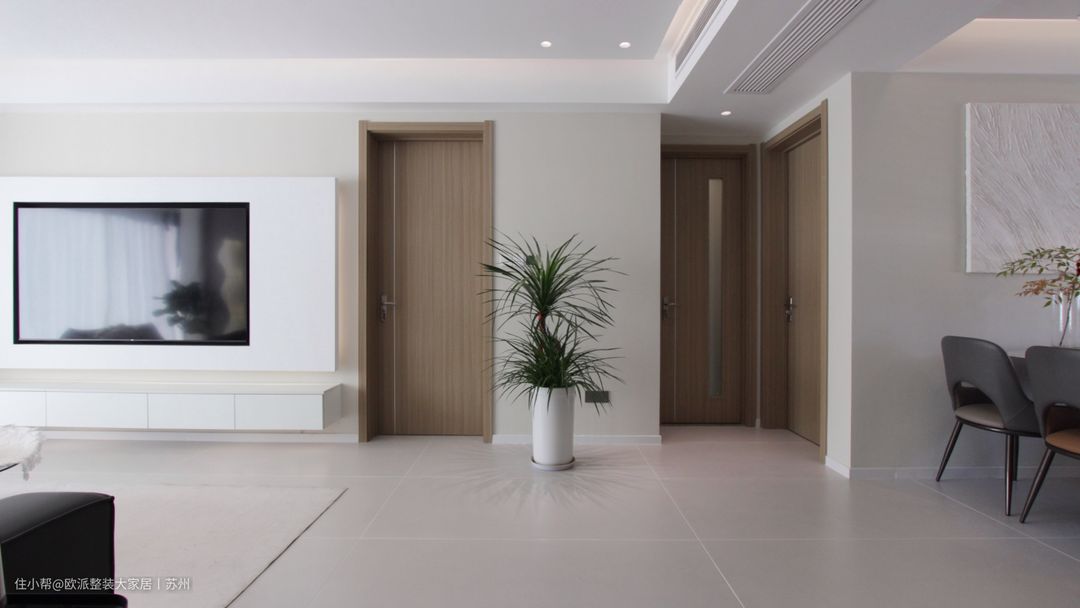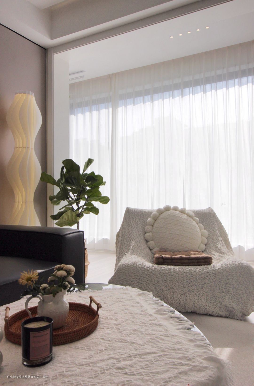 1 客餐厅整体采用开放式的格局设计,相连的空间让视觉效果更显开阔大气,也更具有融通性。顶面采用无主灯设计,运用筒灯做s型光源,制造出简洁大气的空间效果。 2 客厅与阳台打通,进一步扩大客厅空间,最大程度地发挥采光优势,从而实现空间互通与动线流畅。 3 电视背景墙是整个空间的一大亮点,做弧形设计,圆润的曲线代替尖锐的方角,使空间的氛围感更加温柔浪漫。 4 沙发背景墙采用三块饰面板进行铺装打造,并辅以格栅装饰,显示出温润自然的底色。 5 咖色的地毯、玻璃花瓶和花束、简易的落地灯还有一张简易茶几,每一个细节都透出奶奶的氛围感。 6 弧形石膏电视背景墙,创造“悬浮”既视感,上下内嵌灯带,简约且高级。一字型悬空电视柜不占地,基本上不会留下卫生死角,扫地机器人可以自由出入进行清扫,让客厅空间时刻保持干净整洁。 7 客餐厅之间关系是连贯无阻的,居住者能自由地穿梭于不同功能区,完成自己的事情。