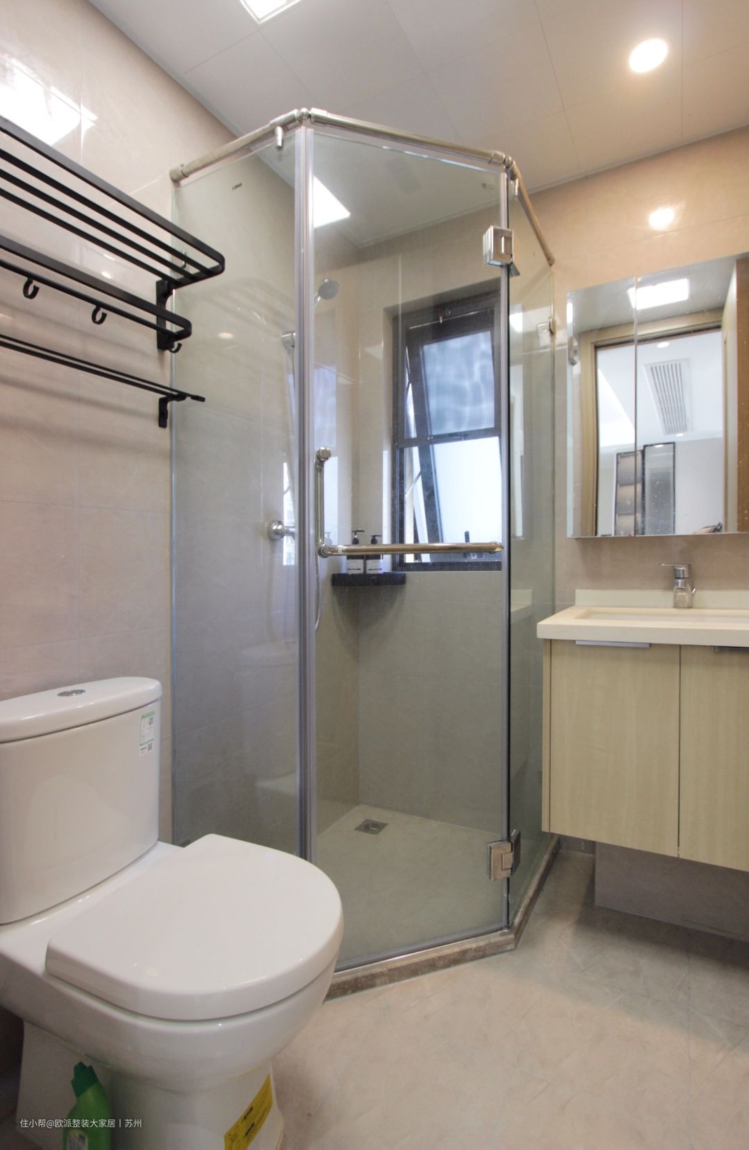 1 客卫的整体设计与主卫保持了统一,原木色浴室柜、马桶、淋浴间,浅色墙砖让空间更显通透明亮。 2 淋浴间安装不锈钢壁龛,加强防水功能,可放置日常洗浴用品。马桶上方的毛巾架,方便安置毛巾、换洗衣物等。