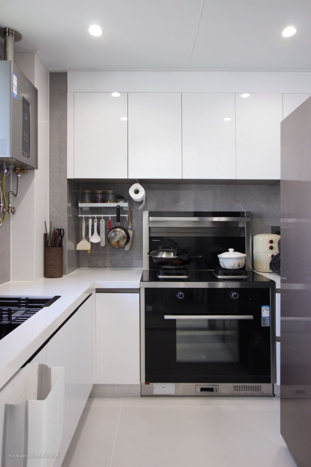 1 L型厨房布局设计,让“洗切炒”动线更合理,取物、洗涤、备餐、烹饪.....一气呵成。 2 同时采用蒸烤一体集成灶,成功地解决了屋主家人所担忧的油烟问题。
