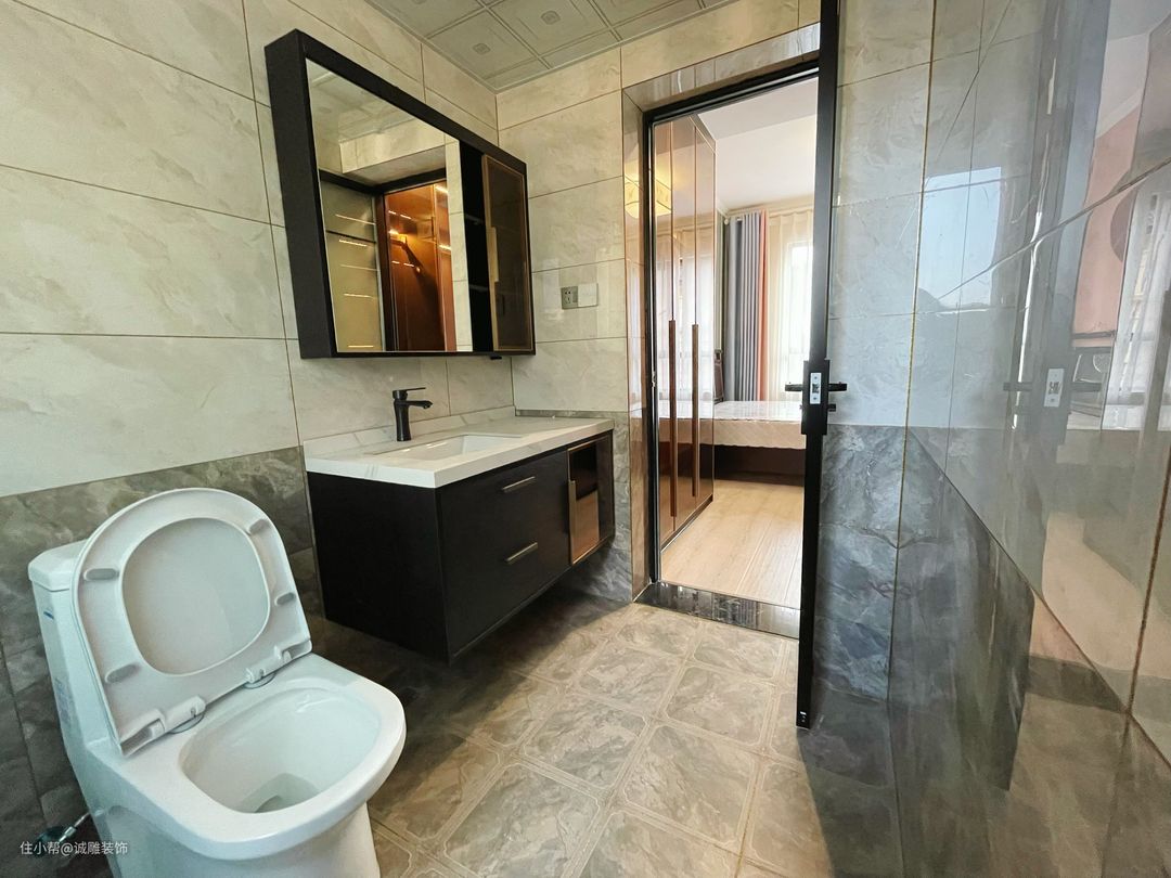 卫生间整体设计以木质元素为主,搭配石灰白的色调,利用墙排式的洗漱池框架设计,打造了一种克制又舒适的新中式美学。