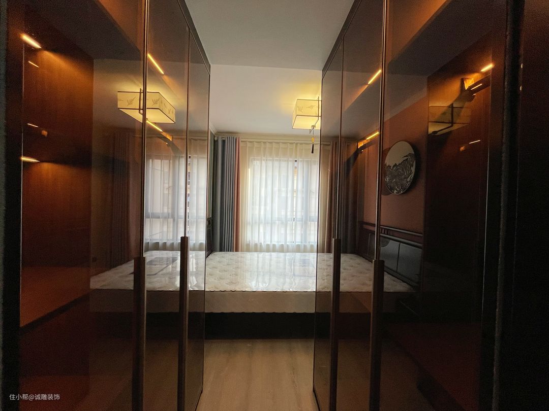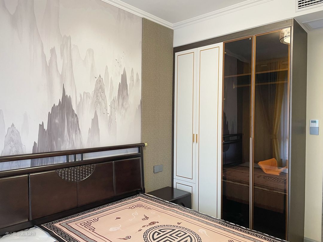 次卧的装修设计以简约为主,简约的同时保留了很大一部分中式的韵味。背景墙挂上一幅水墨画,增加了艺术氛围,衣柜的玻璃门刚好和床的色调统一,营造新中式氛围