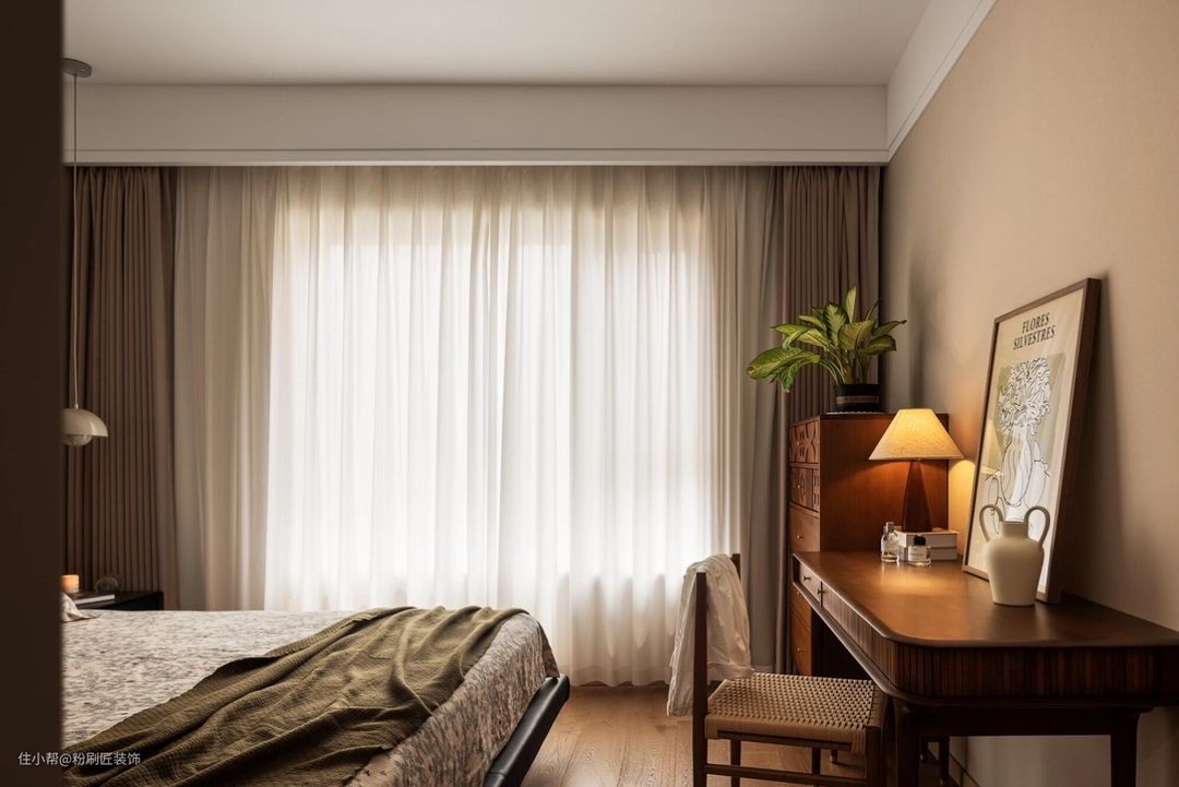 简洁干净的墙面对比纹理突出的胡桃木纹理,是卧室空间里的主要两种材质与颜色搭配, 在简洁干净的基础上,沉稳的胡桃木为空间增添了岁月质感以烘托出浓浓的中古氛围。