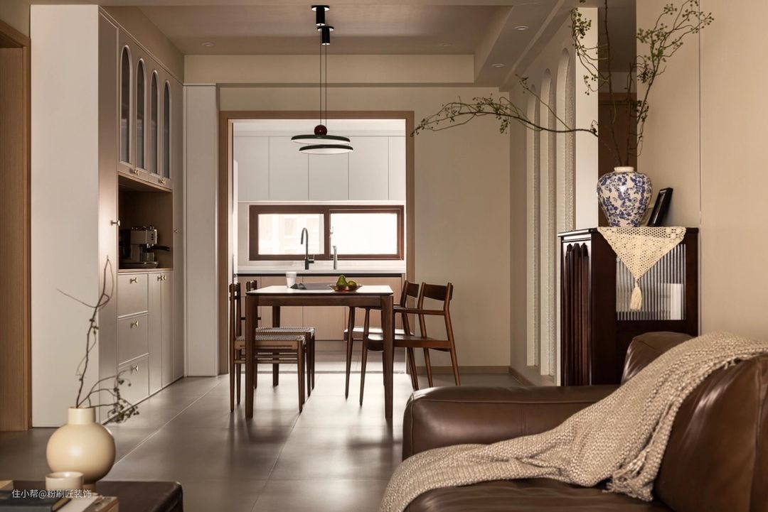 餐厅一侧做石膏造型墙体 上方筒灯作为氛围光源 打光在墙体上 营造氛围感 另一侧墙体做满墙餐边柜 上柜做造型弧形造型玻璃柜门 中间作为镂空区域 放置小家电等 两侧做一门到顶造型柜门 整体效果更加美观 胡桃木的餐桌 与白色的餐边柜搭配的惟妙惟肖 餐桌上方的圆盘灯具作为主光源 提供照明 顶面筒灯作为辅助光源 打造氛围感