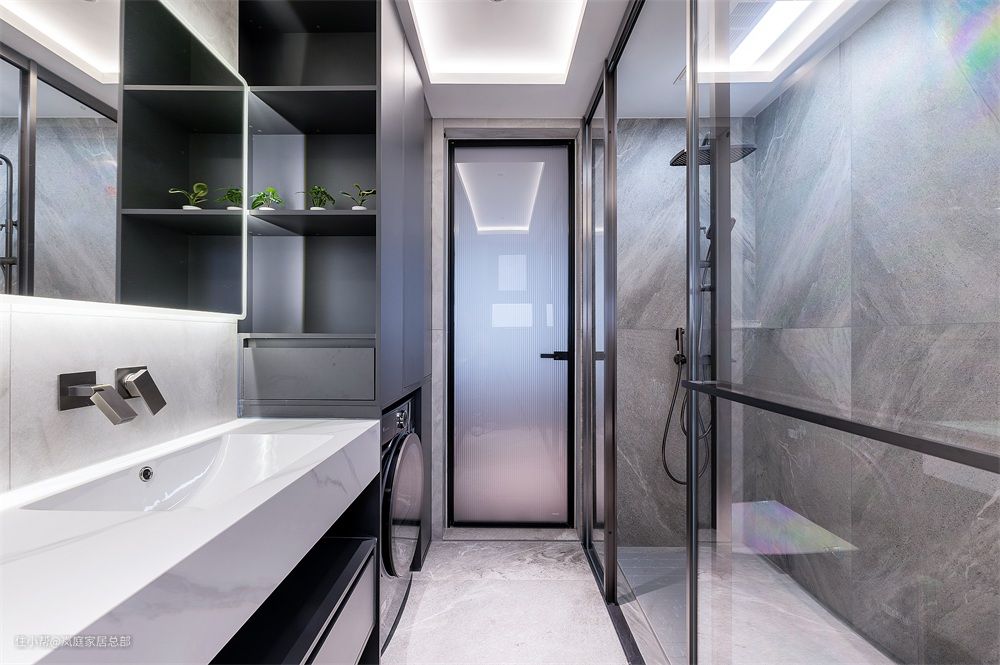 主卫根据业主夫妇的要求装了双台盆,早起使用不拥挤。悬浮式的台盆,底部留空的设计无卫生死角。 淋浴区和如厕区都用玻璃门做了隔断,三分离的设计实用性更强。墙面也是通铺的灰色瓷砖,延续了整屋的主基调色,色彩成就高端品质住宅。 洗漱台旁边还做了一组储物柜,并且预留出空间将洗衣机嵌入,方便水电改造,不浪费空间,也增强了储物能力。 公卫是很常见的长方形户型,最里面的淋浴区用玻璃门隔断开,做到基础的干湿分离。淋浴区地面特意选择了防滑地砖,保证安全性。 定量铺贴了浅灰色的瓷砖,防潮又耐看,不易产生视觉疲劳。石膏板的吊顶设计,颜值更高,实用性也在线防潮性好。 棕色的洗漱台,跟空间色彩契合。同样是经典的悬浮款式,无卫生死角。搭配上自带LED智能灯带的镜柜,储物功能也很强大。