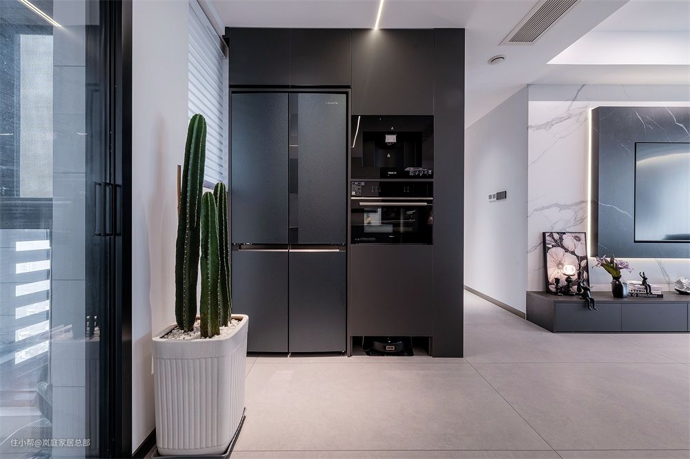 厨房的原始户型就比较方正,因为业主觉得空间有点小,所以就将厨房的非承重墙拆除做了开放式的设计,瞬间就拉伸了公区的开阔度。 经典的L型橱柜布局,不过还在厨房边增加了吧台,不浪费空间,扩大使用面积,还提升了家居品位。高低台的设计从人体工学的角度出发,不累腰。 一体式的黑色橱柜,墙地面则是选用的白色柔光砖铺贴,经典的黑白配,百搭不过时。柜子还做了无把手的设计,使用便利又美观。 厨房的另一侧墙面则是做了定制的橱柜,并且将冰箱和蒸烤箱嵌入,美观又实用。与生活阳台之间用玻璃门隔断,不影响采光。