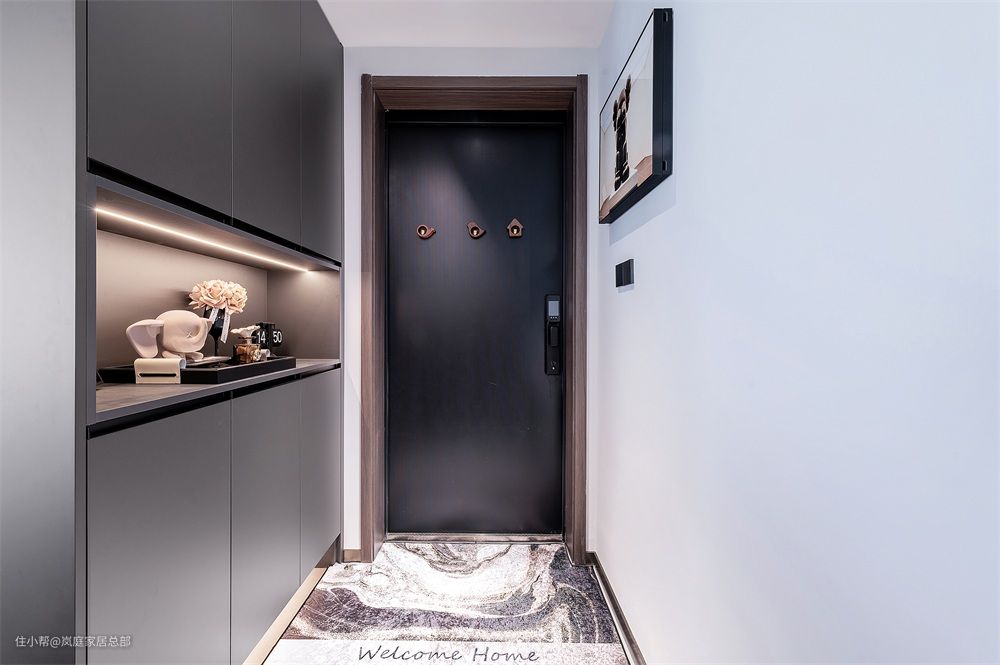 玄关直接跟餐边柜结合做了一体式的柜子,同样是顶天立地的设计,不过中间和下方做了留空,进出门放鞋储物更方便。 留空的位置安装灯带,温暖治愈的灯光营造舒适的休闲氛围。无把手的柜子,看上去更简洁大方,也不易磕碰。