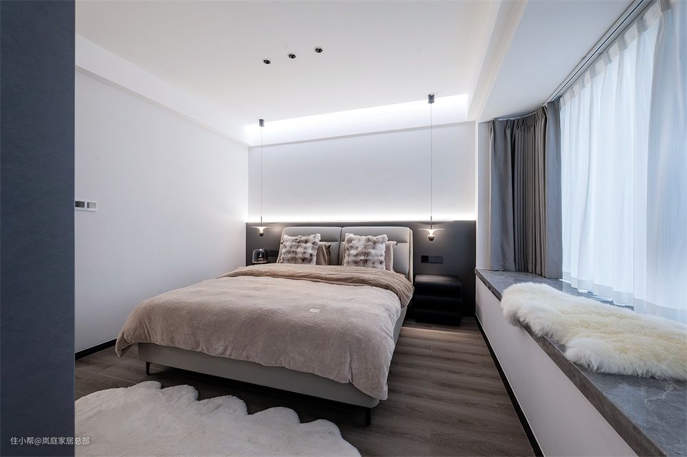 业主夫妇觉得卧室面积有点小,而且业主希望能增加一个衣帽间。最终结合实际户型将主次卧打通,扩大面积后调转床头方向,在床尾做了衣帽间。 衣帽间左右两侧留出过道,动线更合理。卧室吊顶也延续了公区的无主灯实际,只是在床头额外安装了小型吊灯,起到点睛之笔的作用,烘托良好的睡眠氛围。 上下拼接的床头背景墙,色彩也和整屋契合,保证和谐美观性。加上立体的线条等待,即使是简单的造型,但视觉效果更饱满。 床尾的衣帽间做了双一字型的布局,定制的一柜到顶设计,储物量超足。并且在其中一侧做了一体式的梳妆台,一举两得。 全屋柜子都是统一定制的黑色系搭配,高雅大气的黑色,也是这个家的特色。卫生间用长虹玻璃门隔断,既不影响采光,也保证了隐私性。 另外可以看到卧室地面跟公区不一样,在卧室而是选择了天然的木地板铺贴,木材本身就独具温润清新的气息,更有利于营造温馨舒适的环境。