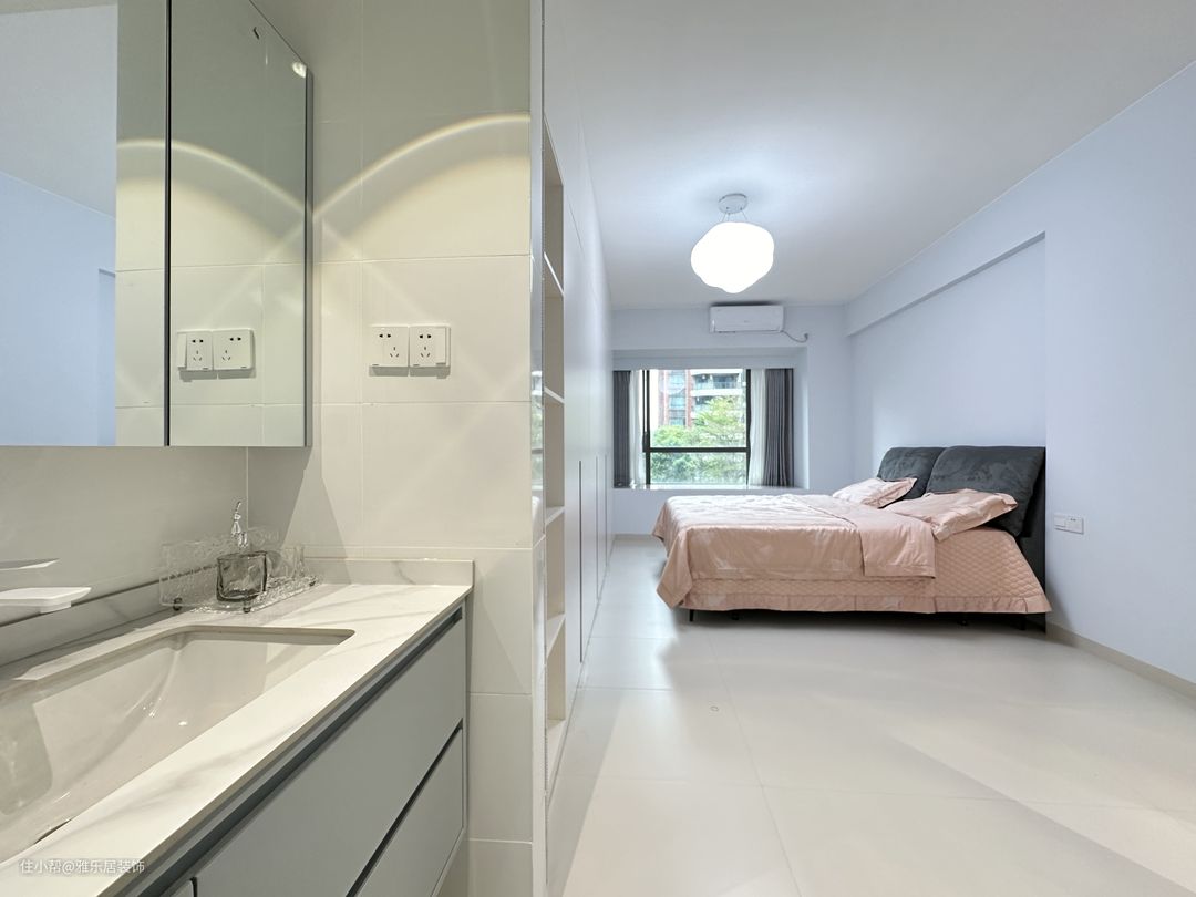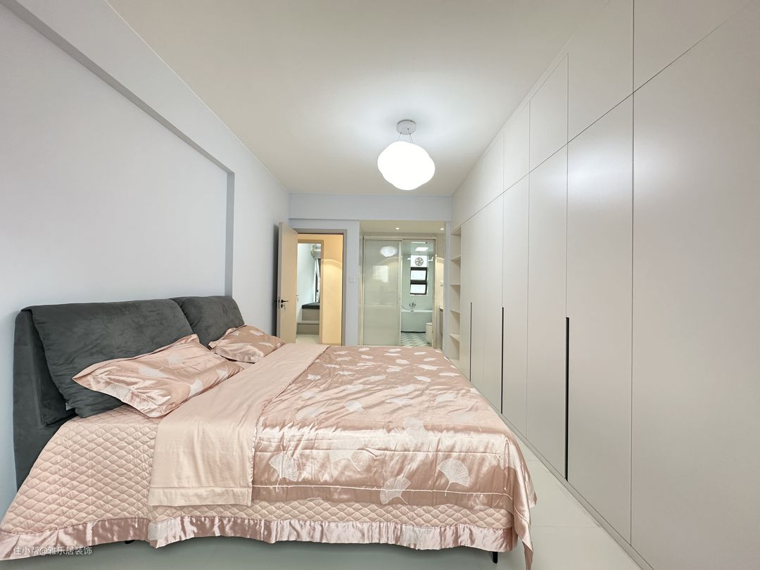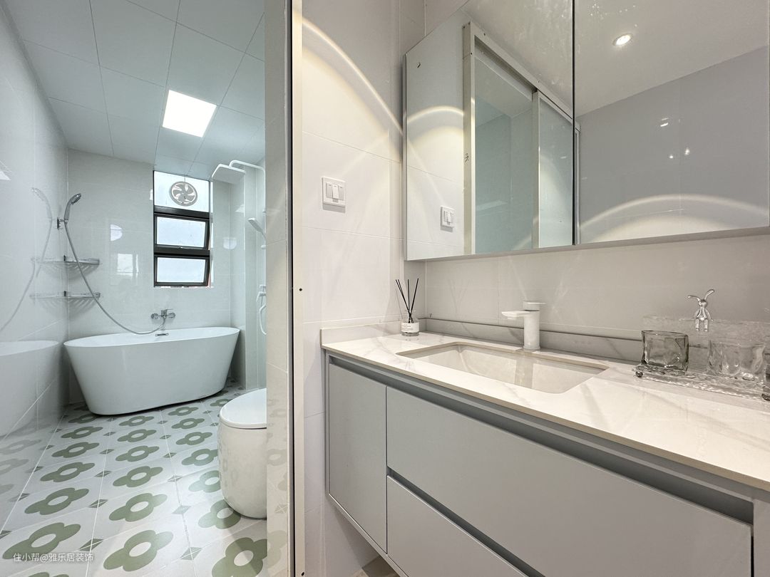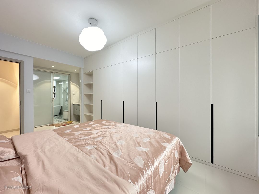 主卧定制整墙到顶衣柜,搭配隐形线型拉手,美观又实用。套卫洗手台外置,里外同时使用互不影响,推拉门代替平开门,更省空间,清新的小花砖搭配上浴缸,下了班舒舒服服的泡个澡,可太安逸了!