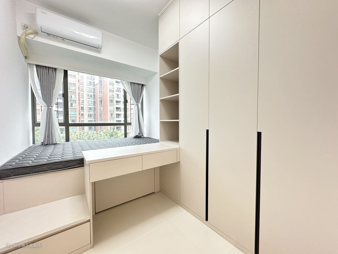 多功能房选择全白色调的硬装,宽敞明亮,利用飘窗打造一个工作台,空间不浪费!配备一张沙发床,有亲友到访秒变客卧。