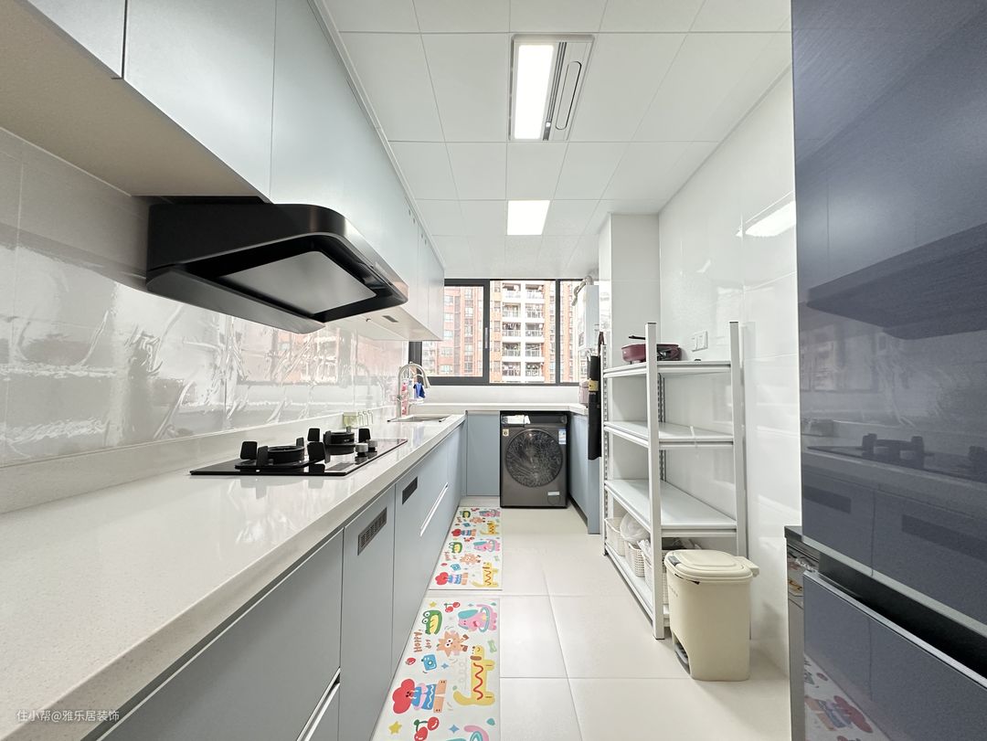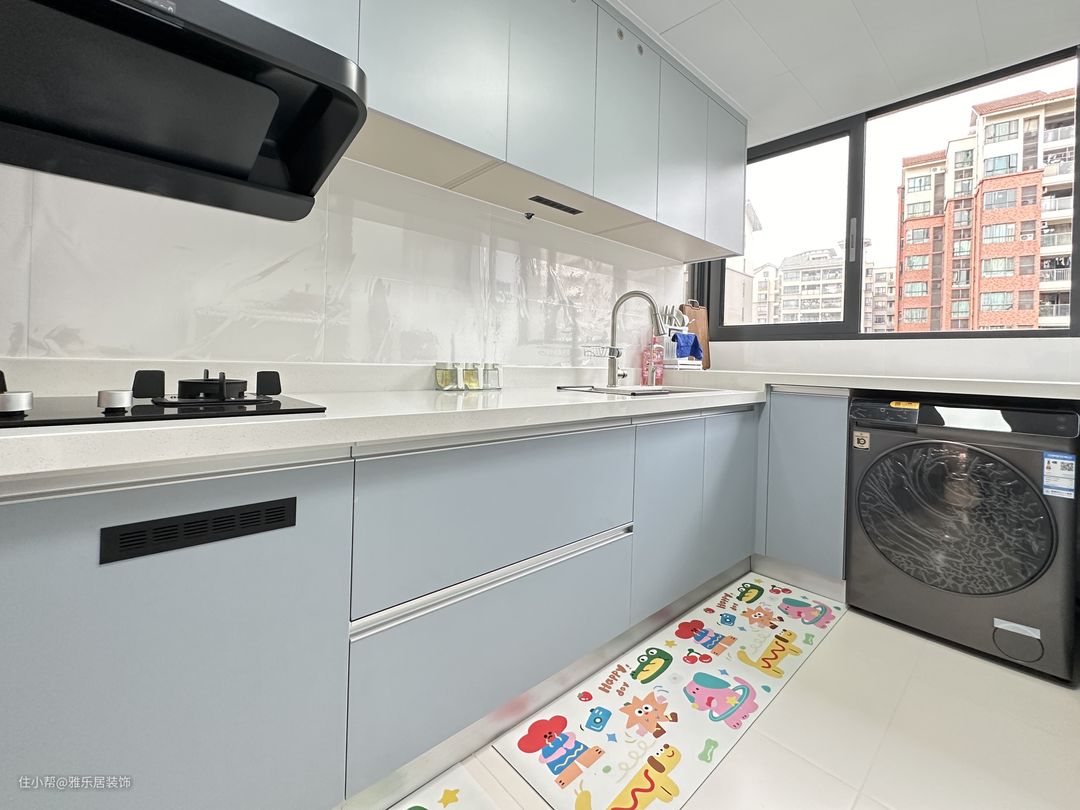 L字型厨房布局选择了温柔的奶蓝色,高低台的设计使用更舒适,亲肤门板更舒适。