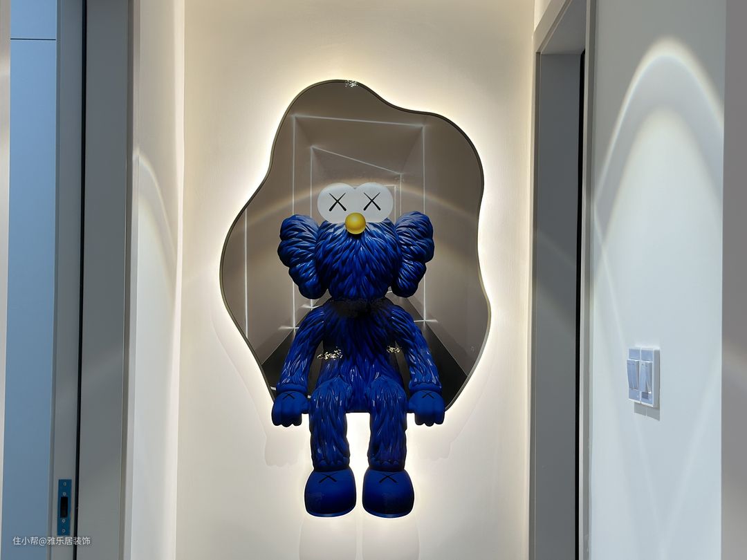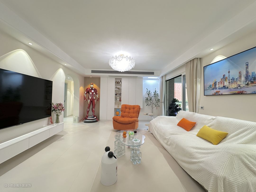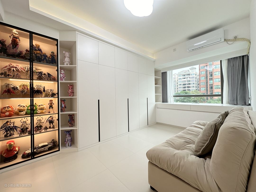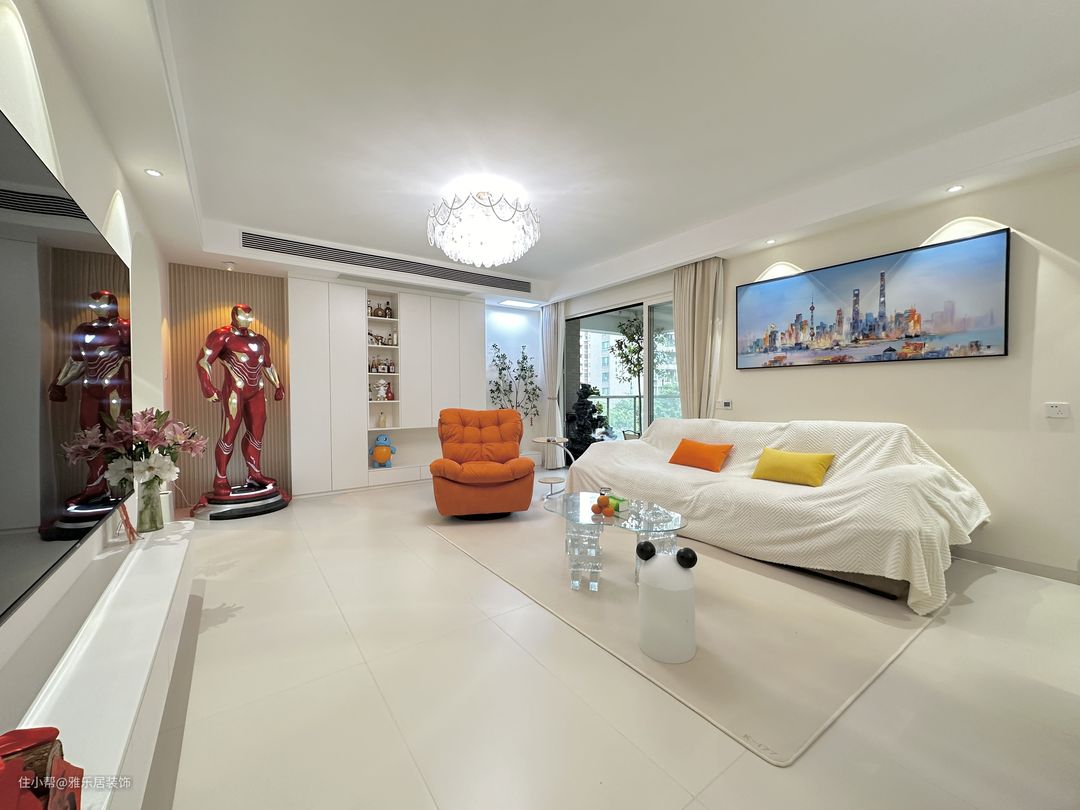 客厅通铺750*1500哑光砖,以奶油色为主基调。客厅仿佛一个网红咖啡厅,错落有致的收纳柜侧边预留绿植区,还配置了一个钢铁侠的模型,加上氛围灯的渲染,妥妥的ins风!