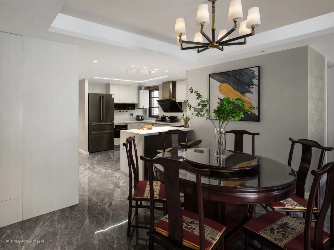 从客厅望向餐厅,一幅别样的风景映入眼帘。深灰色的釉面大理石地砖与红木色的餐桌餐椅相互映衬,色彩过渡自然,层次分明。不同材质的碰撞,凸显出中式的包容与雅致,散发出浓浓的中式韵味,让人倍感舒适。