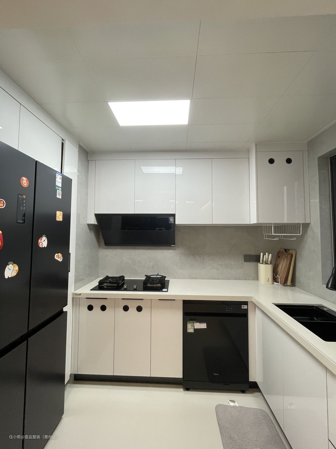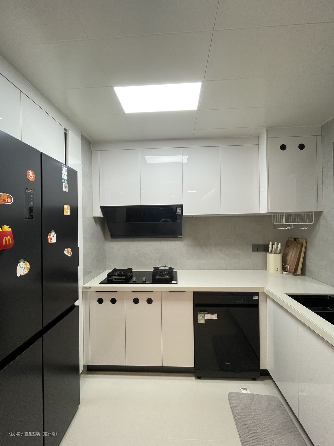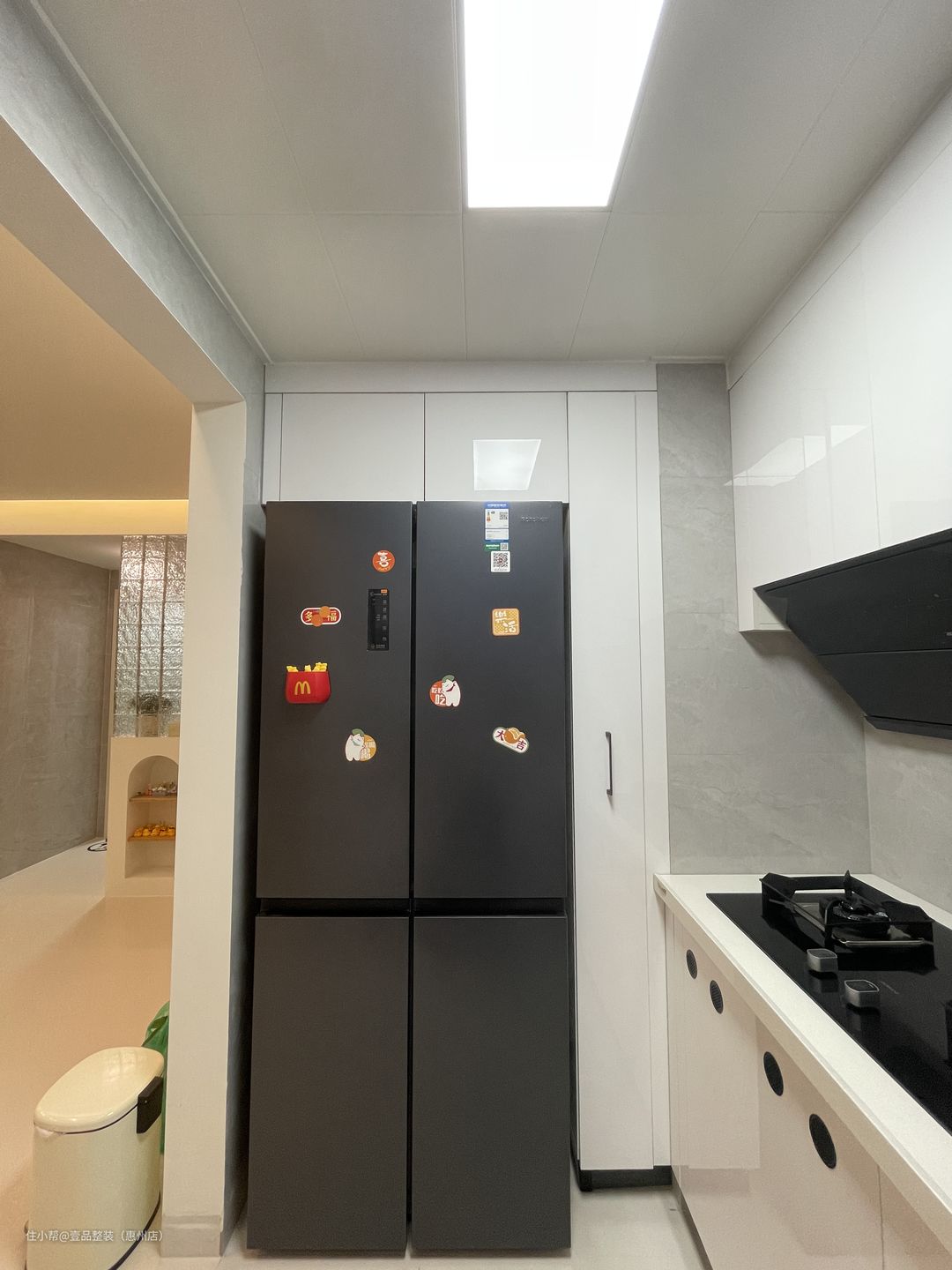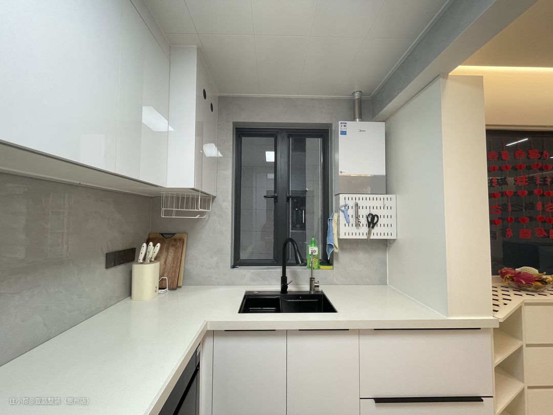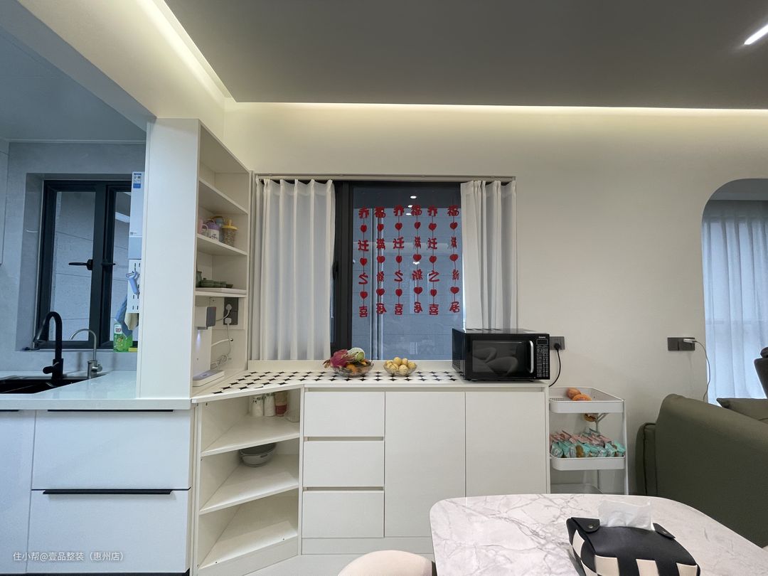 为了视觉上提高空间,将厨房的门洞拆掉做开放式,与餐厅做一体化设计。里面U型布局,冰箱内置,旁边的空隙做竖排到顶柜,个性化设计加强全屋的储物面积。