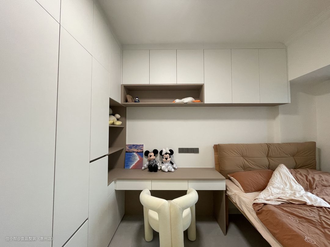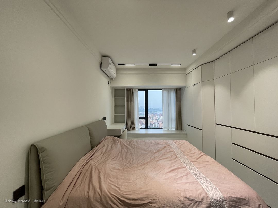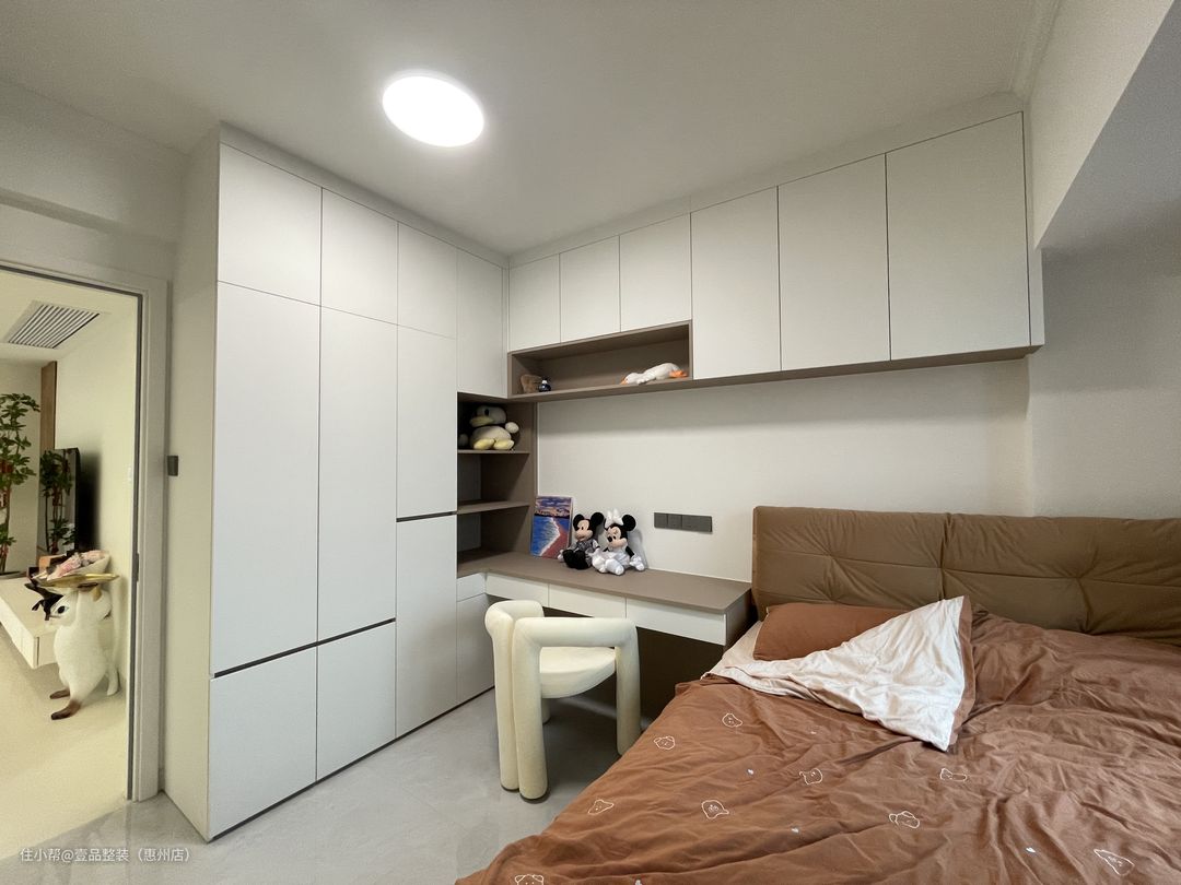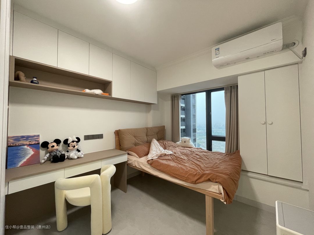 为了充分利用空间,次卧定制高脚床设计,连接飘窗台,将飘窗60cm宽的空间都利用起来。床尾定制到顶柜,增加储物。门边的到顶柜连接到床头做转角书桌一体柜,留空设计方便后期的使用空间。